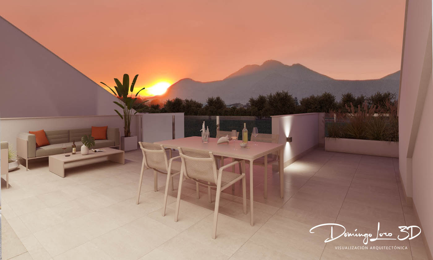 Estos renders de arquitectura 3D muestran una tipología con parcela independiente en una urbanización residencial en Roda Golf y han sido realizados para la comercialización de una promoción inmobiliaria.