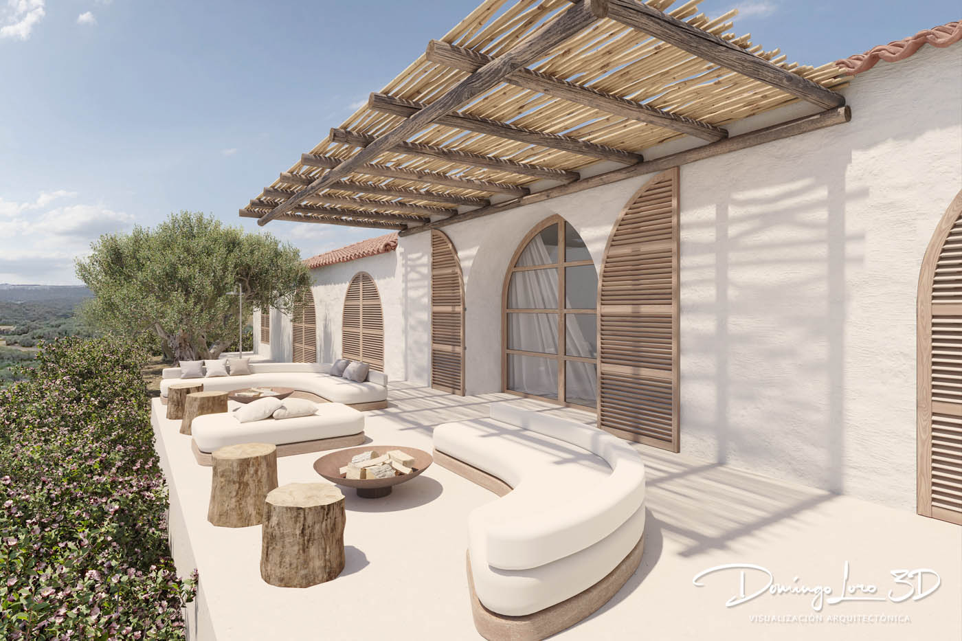 Estas recreaciones virtuales realizadas con infografía 3D de una villa en Menorca muestran, a través de varios renders, una bonita villa de estilo balear.