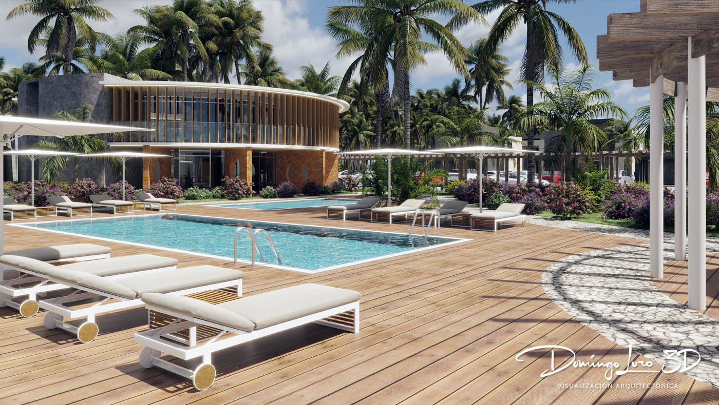 Renders 3D del exterior y zonas comunes de un complejo urbanístico residencial en Dominicana que se han desarrollado para la visualización y comercialización de una promoción inmobiliaria, varias recreaciones virtuales desarrolladas con gran calidad, detalle y realismo. Con renders 3D se pueden conseguir impactantes imágenes de cualquier proyecto mucho antes de ejecutar la obra. Hoy en día se realizan renders 3D para visualizar todo tipo de proyectos, ya sean grandes complejos urbanísticos o pequeños proyectos arquitectónicos, trabajamos para todo tipo de profesionales y empresas con la mejor relación calidad y precio del mercado.