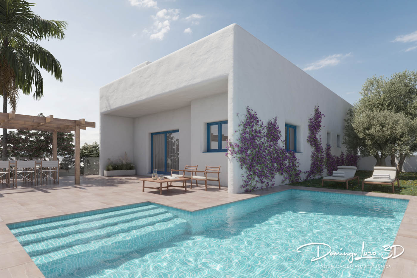 Render de arquitectura 3D de una vivienda unifamiliar con parcela independiente de estilo ibicenco.