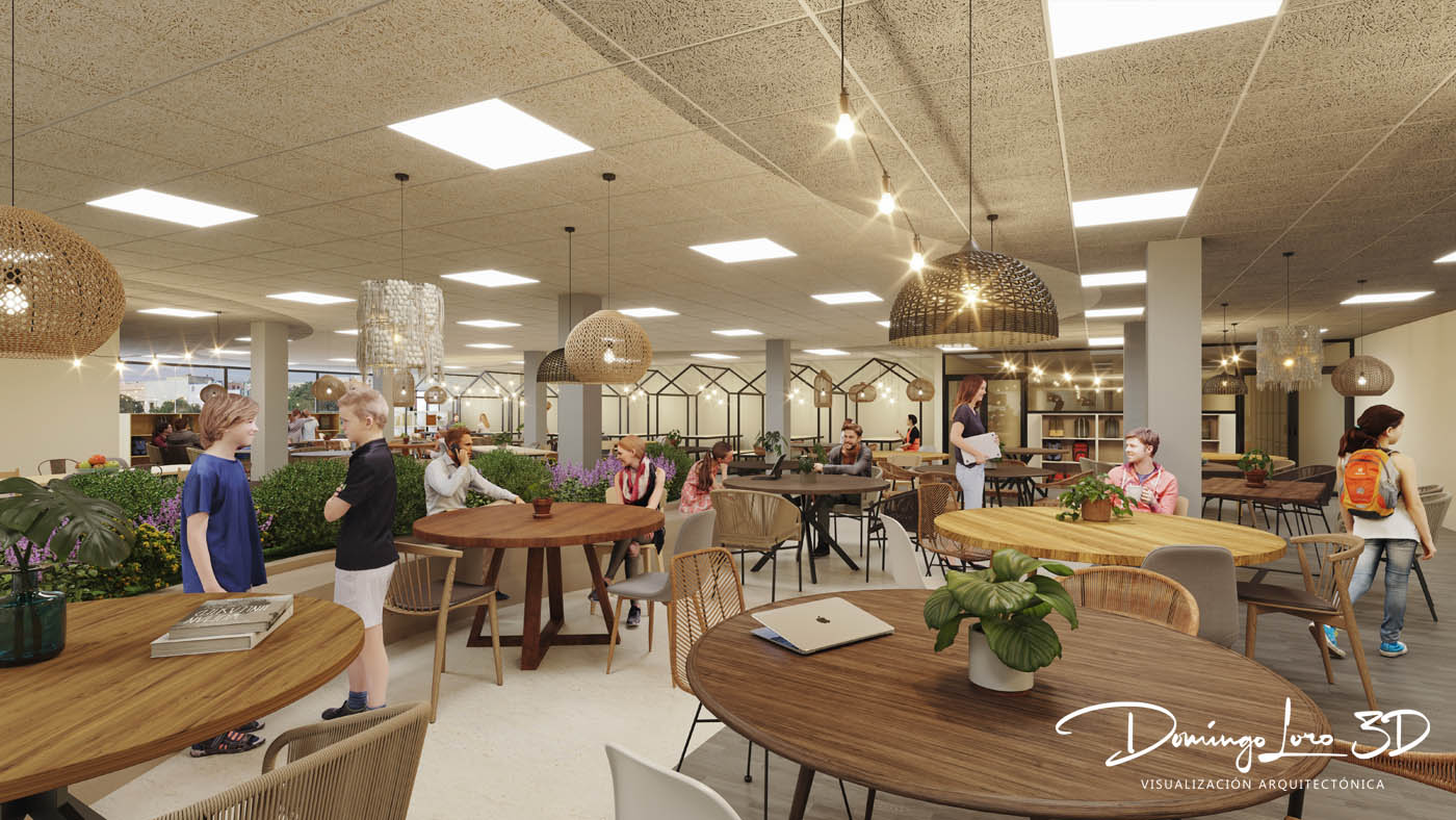 Infografía 3D de espacios creativos de aprendizaje que son una de las herramientas clave en el marketing para la comercialización de este proyecto. Renders de interiores 3D con la mejor relación calidad y precio del mercado.