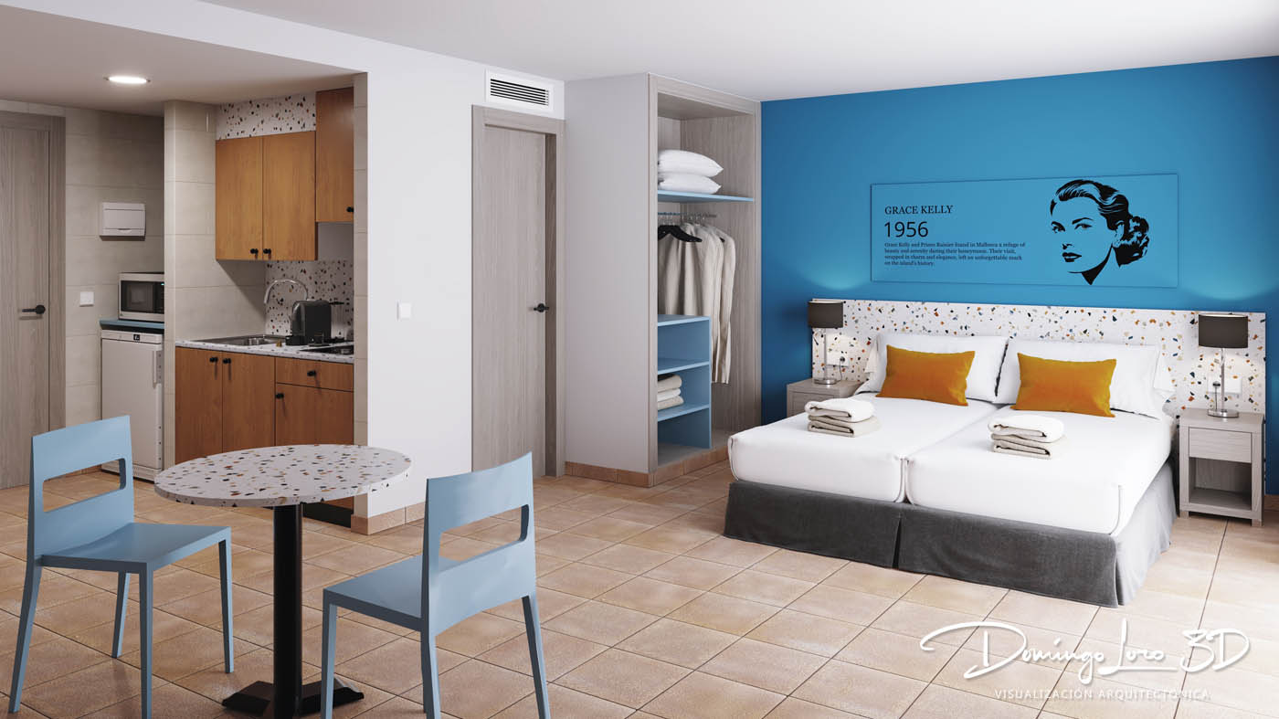 Renders 3D de las habitaciones de un hotel en Palma de Mallorca