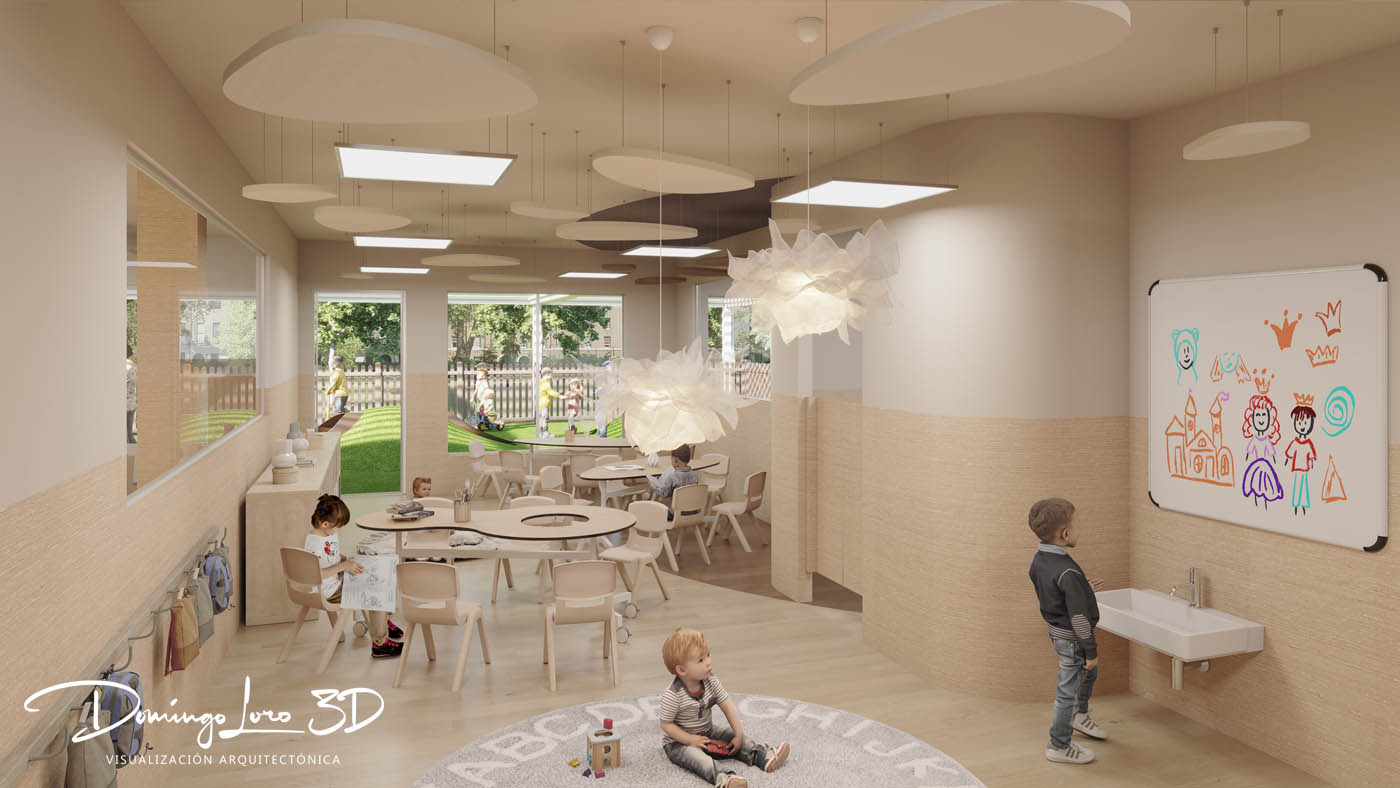 „Inmobiliarias, arquitectos, interioristas y empresas promotoras nacionales e internacionales contactan con nosotros habitualmente para realizar infografías 3D para la comercialización de promociones inmobiliarias y proyectos de interiorismo. Estos renders 3D del interior de un centro escolar son solo un ejemplo de los miles realizados durante nuestra larga trayectoria.“