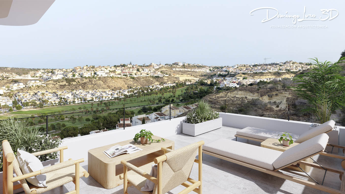 „Estas infografías 3D de viviendas en un campo de golf en Alicante complementan un conjunto de imágenes de los distintos modelos arquitectónicos de viviendas que conforman la oferta de esta promoción inmobiliaria exclusiva.“