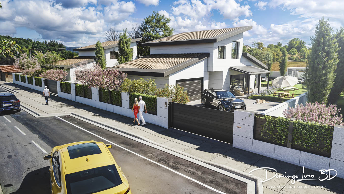 Imagina una parcela vacía en las afueras de Vitoria: con un render puedes ver cómo se transformará en una vivienda moderna con jardín, garaje y terrazas.