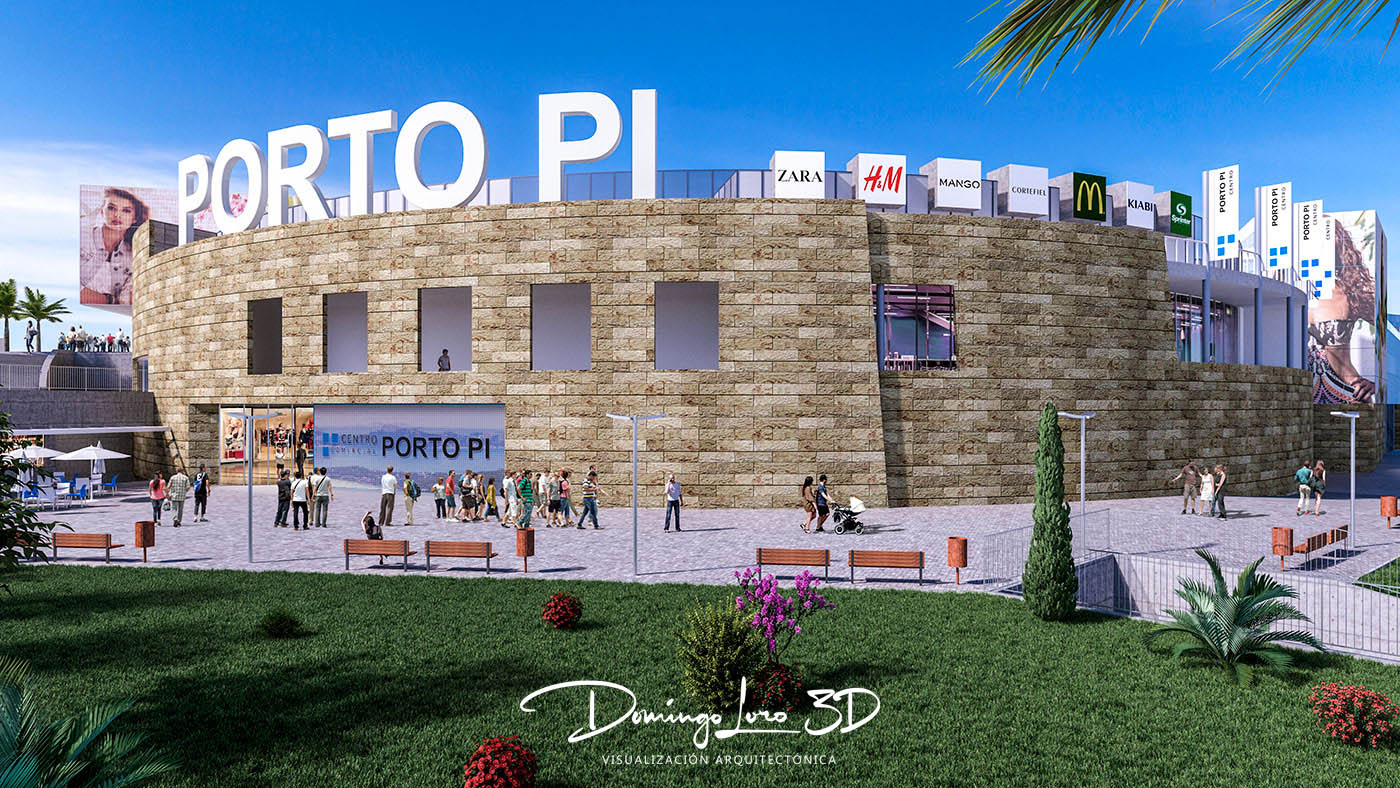 Para la recreación virtual de la rehabilitación de este proyecto se han realizado multitud de renders 3D realizados con infografía de las fachadas exteriores e interiores del centro comercial partiendo de imágenes del estado actual. Se trataba de recrear virtualmente la rehabilitación integral del centro comercial Porto Pi en Palma de Mallorca, para valorar como será el resultado tras la futura obra. Recreación virtual de gran realismo y alto impacto visual a través de imágenes realizadas con infografía 3D que suponen una herramienta fundamental para el desarrollo del proyecto y su comercialización ya que las imágenes conseguidas no dejan espacio para las dudas o la improvisación y se puede visualizar perfectamente como será el resultado una vez acometida la rehabilitación del Centro Comercial.