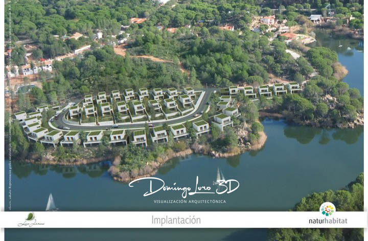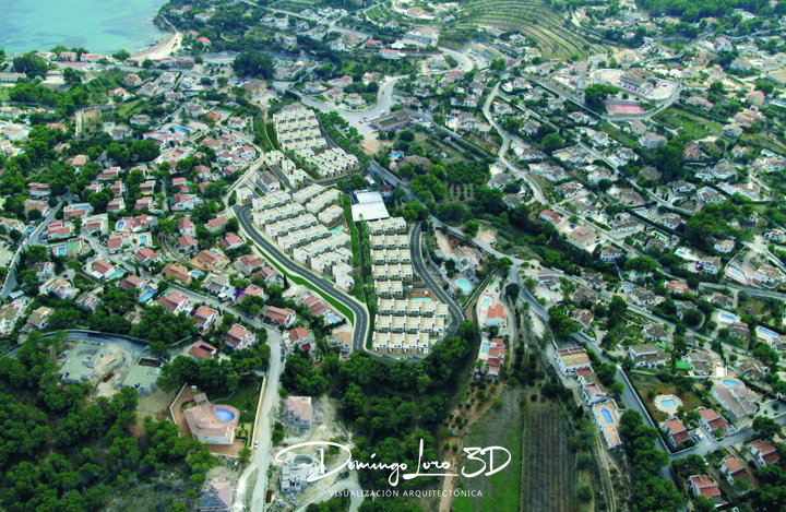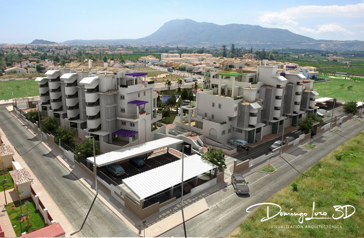 La integración 3D que ilustra este artículo es precisamente un render de arquitectura 3D que, realizada la foto de la parcela en donde se van a construir un conjunto de siete dúplex adosados, se han integrado sobre la foto para ver con exactitud el resultado final del proyecto y así visualizar como se van a relacionar con el entorno y resto de edificios de la urbanización.