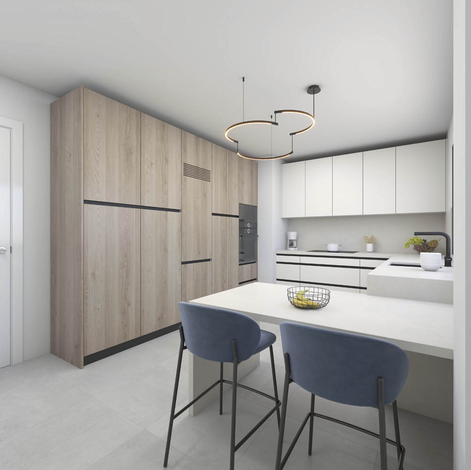 Renders 3D de una cocina desarrollados con infografía 3D para una tienda del sector para mostrar el resultado de un diseño a un cliente particular, tenemos más de dos décadas de experiencia en el sector de la infografía 3D realizando proyectos, mediante recreaciones virtuales realizadas con renders 3D, para la ilustración de catálogos de muebles y productos de todo tipo: cocinas, muebles de baño, dormitorios, mamparas de baño, platos de ducha, lavabos, espejos, mesas, muebles de oficina, vestidores, puertas, ventanas, tuberías, taquillas, colchones, etc. Si está interesado en la realización de renders 3D para la ilustración de cualquier producto. ¡Hable con nosotros!. Trabajamos para tiendas y fabricantes de cocinas en toda España.