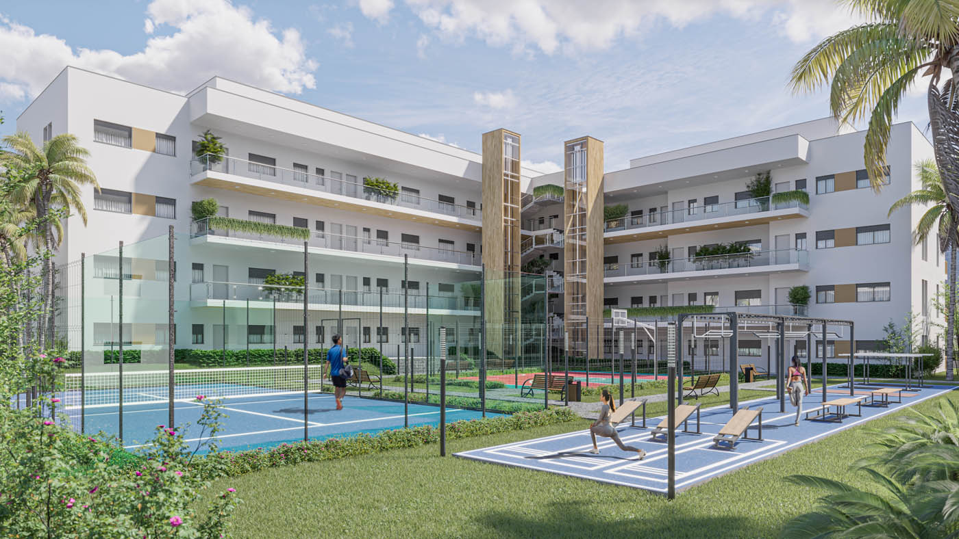 Render 3D de arquitectura en Tenerife - Vista de las zonas comunes de la urbanización
