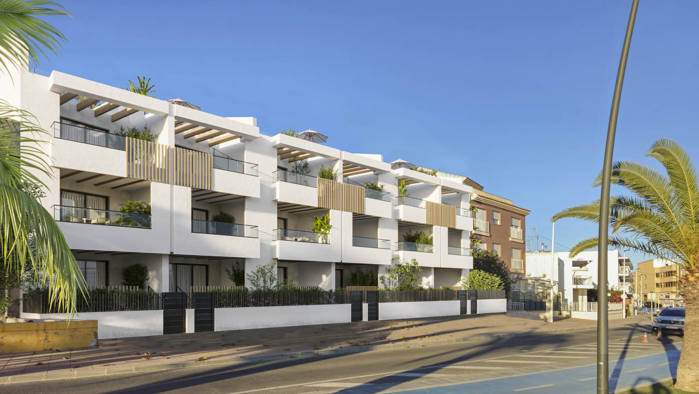 Las infografías 3D también destacan el entorno del edificio, frente al paseo marítimo y zonas de recreo al aire libre. La proximidad a la playa de Lo Pagán es evidente, brindando a los residentes la oportunidad de disfrutar de la vida al aire libre y de las actividades acuáticas durante todo el año.