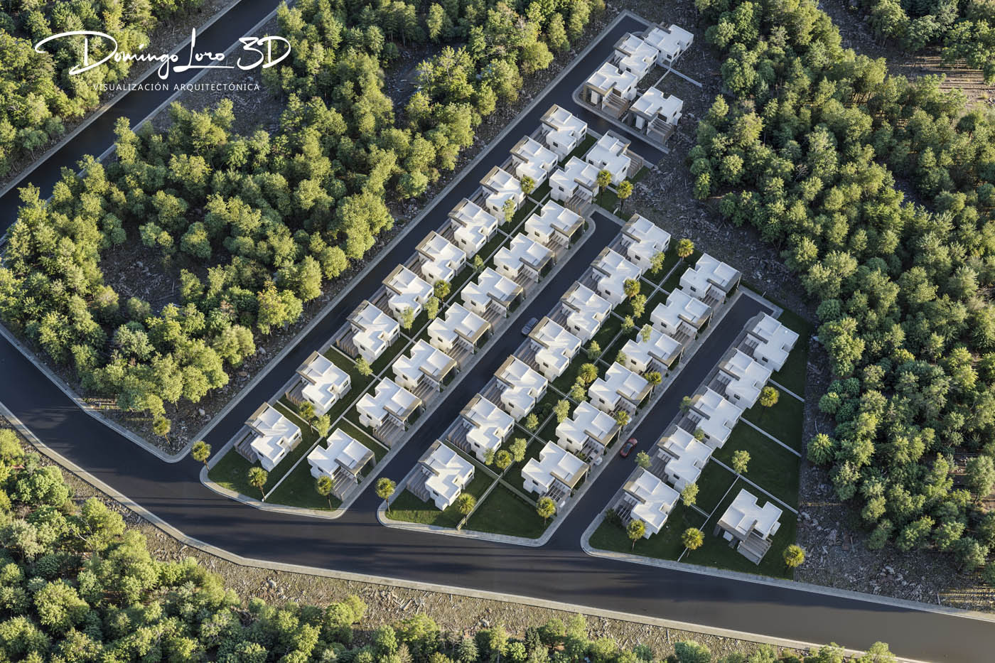 Renders 3D de una urbanización residencial de villas independientes. Varias recreaciones virtuales para representar el exterior de la urbanización desde varios puntos de vista para visualizar este conjunto de villas con parcela independiente. Mediante renders realizados con infografía 3D se pueden conseguir todo tipo de vistas para la comercialización de promociones inmobiliarias, trabajamos para empresas de toda España, nuestra metodología de trabajo nos permite colaborar desde la distancia consiguiendo un resultado profesional. 25 años de experiencia para conseguir la mejor imágen para su proyecto.