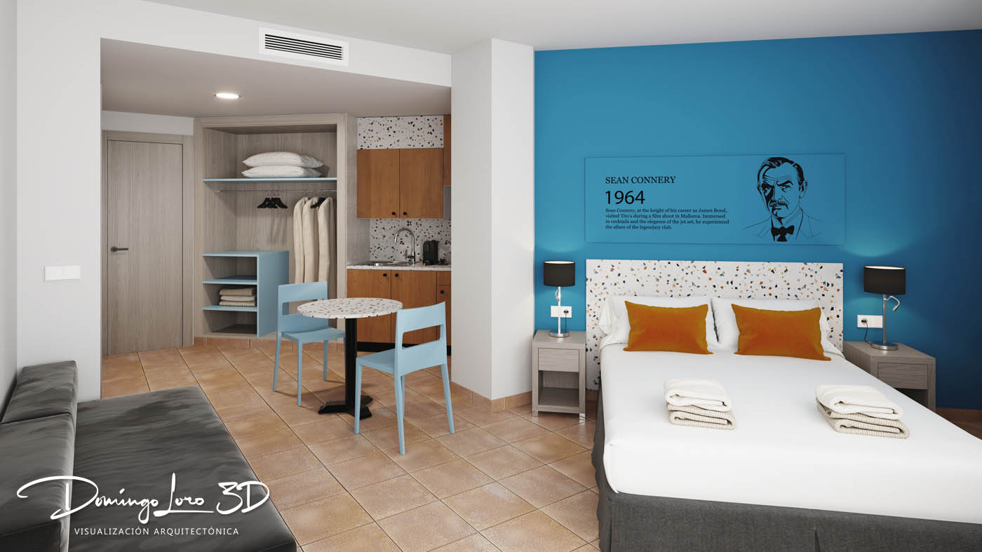 Renders 3D de las habitaciones de un hotel en Palma de Mallorca