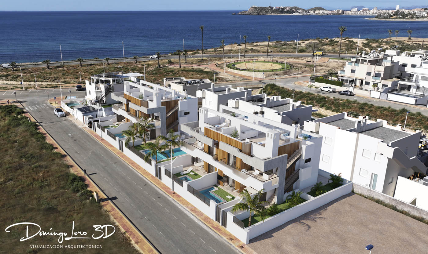 Lo más habitual es realizar renders de arquitectura 3D para la representación del exterior de la promoción inmobiliaria, con esto se consigue visualizar con un alto grado de realismo las fachadas del inmueble con gran calidad, detalle y realismo y se pueden resolver todas las dudas como: forma del proyecto, materiales, espacios exteriores, etc. mucho antes del incio de la obra. El uso de este tipo de recreaciones virtuales está muy extendido y es muy utilizado en el sector inmobiliario y por parte de arquitectos para la visualización de todo tipo de proyectos. Normalmente este tipo de imágenes se desarrolla con una iluminación diurna para mostrar el mejor aspecto que tendría el futuro inmueble en condiciones de iluminación perfectas en un día soleado.
