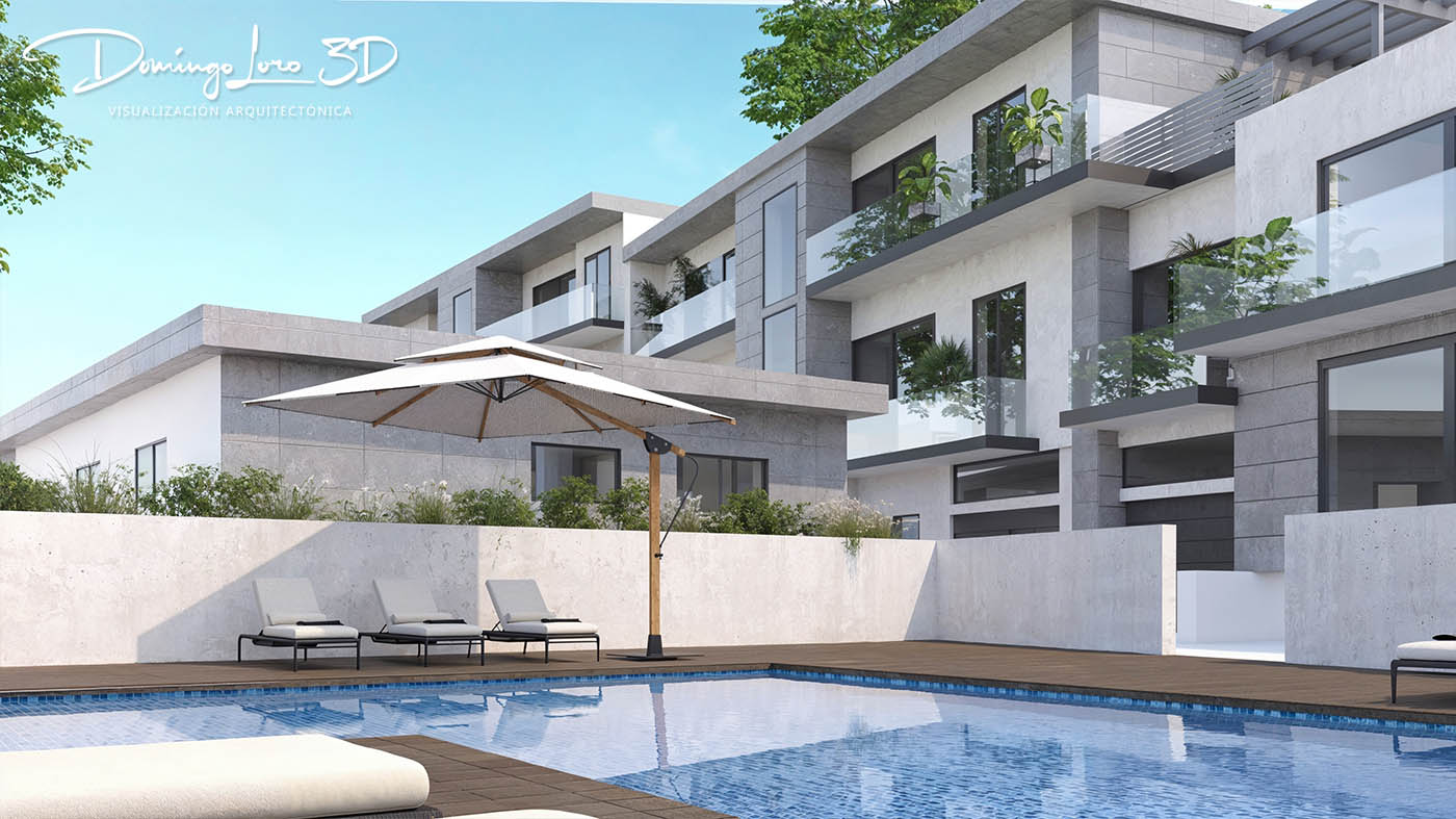 Un render de arquitectura 3D resuelve en gran medida todo tipo de dudas como son la estética exterior del proyecto, su ubicación, entorno que la rodea e incluso como se adapta la construcción al terreno. Con renders 3D se pueden conseguir espectaculares recreaciones virtuales que resolverán todas estas dudas y darán a nuestro proyecto una vista única de gran realismo y alto impacto visual muy útiles para la comercialización de promociones inmobiliarias.