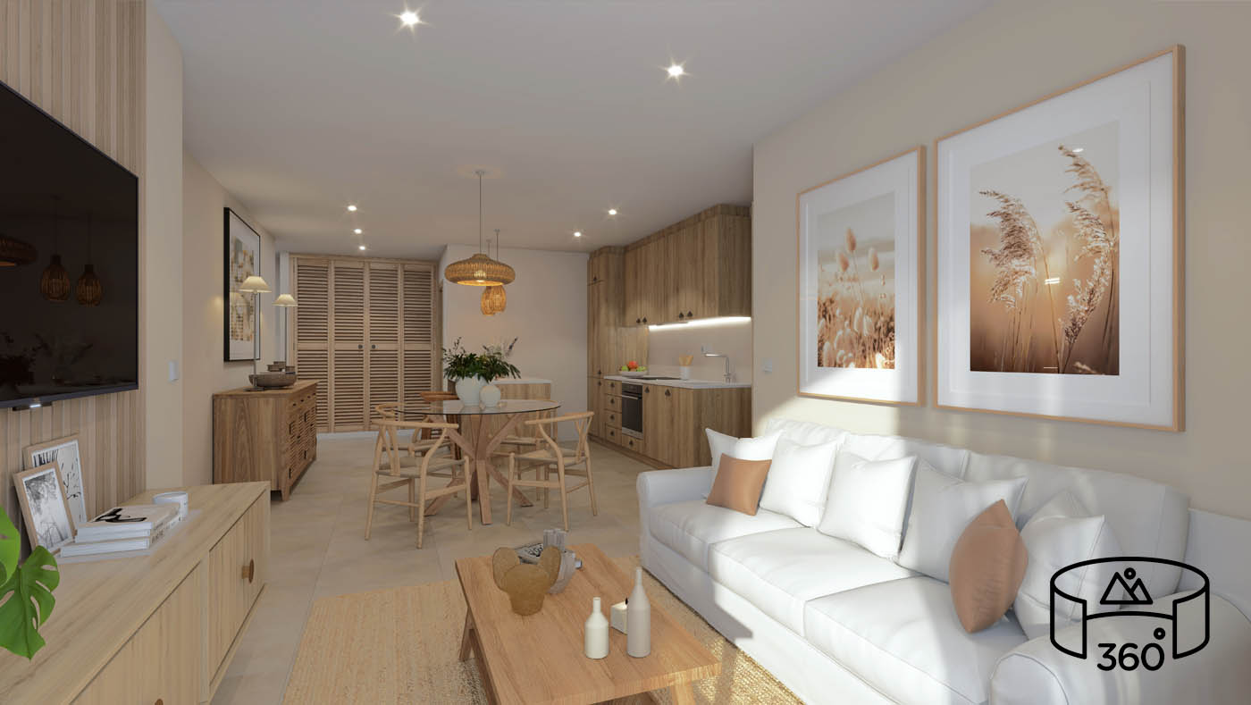 Un tour virtual 360 con infografía 3D es una experiencia interactiva que permite recorrer un alojamiento como si estuvieras dentro, pero generado a partir de renders 3D fotorrealistas (no de fotografías o escaneos). Cada “parada” del recorrido es una vista equirectangular (formato 2:1) que abarca 360° en horizontal y 180° en vertical. El usuario navega mediante hotspots, miniaturas y un menú de estancias, y puede activar capas de información (medidas, equipamiento, normas de la casa, etc.). En nuestro estudio llevamos más de 25 años creando herramientas de visualización para el sector turístico e inmobiliario, y este formato es, hoy por hoy, el que mejor equilibra impacto visual y control creativo.