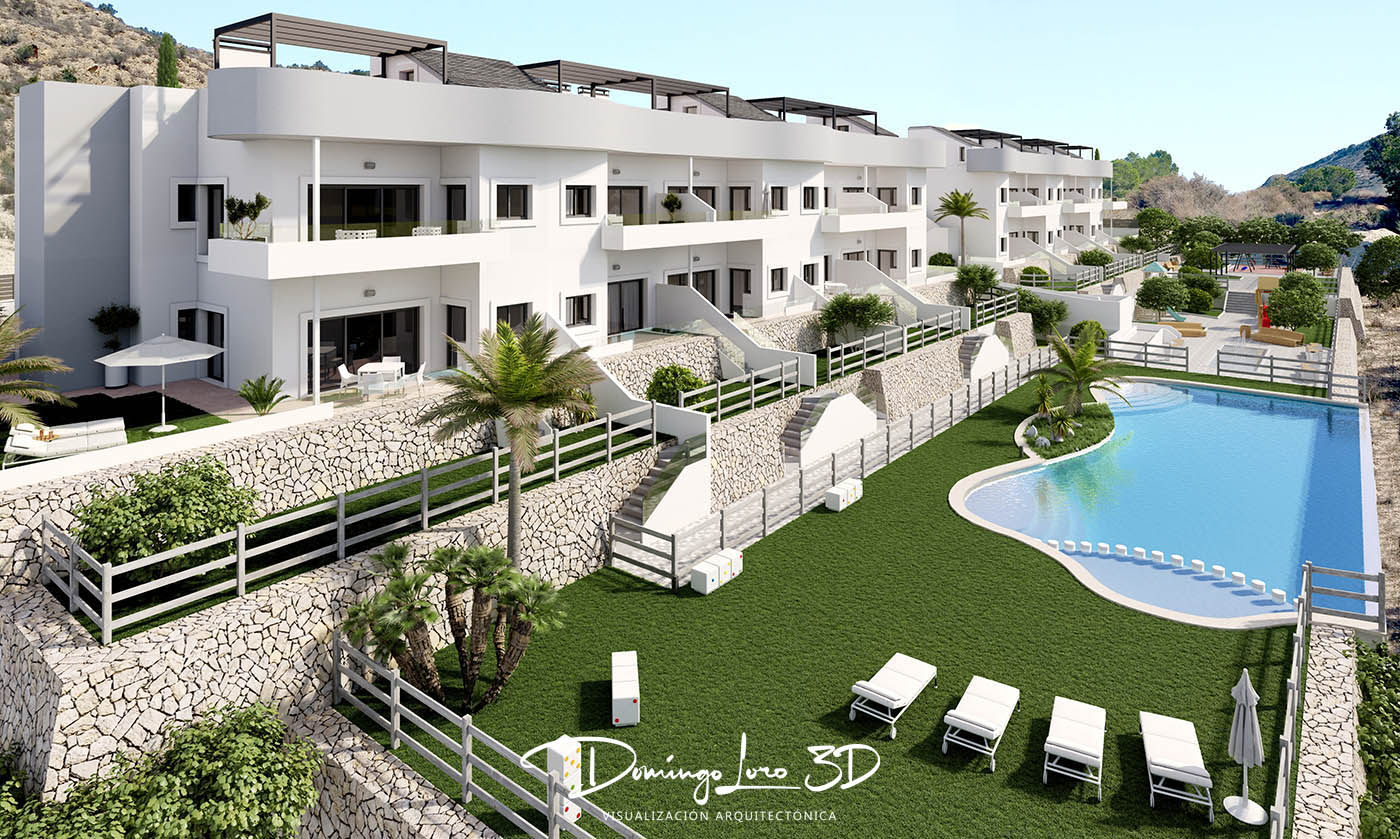 El render 3D de arquitectura que ilustra este artículo es un ejemplo de visualización arquitectónica para una promoción inmobiliaria, una representación de un conjunto de viviendas con plantas bajas con jardín y plantas primeras con solarium en una urbamización con piscina, zonas verdes y juegos infantiles. Un render realizado con infografía 3D para representar esta urbanización en una sola imagen que sirve como un buen ejemplo de visualización arquitectónica de una urbanización.