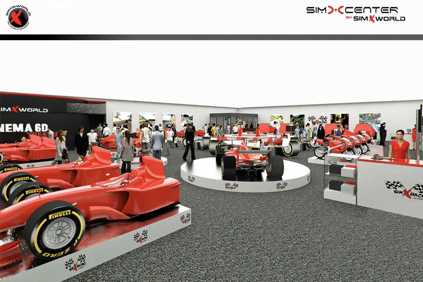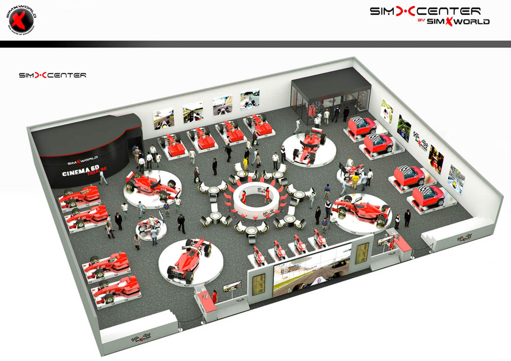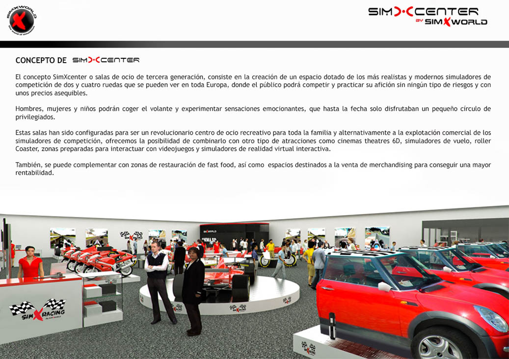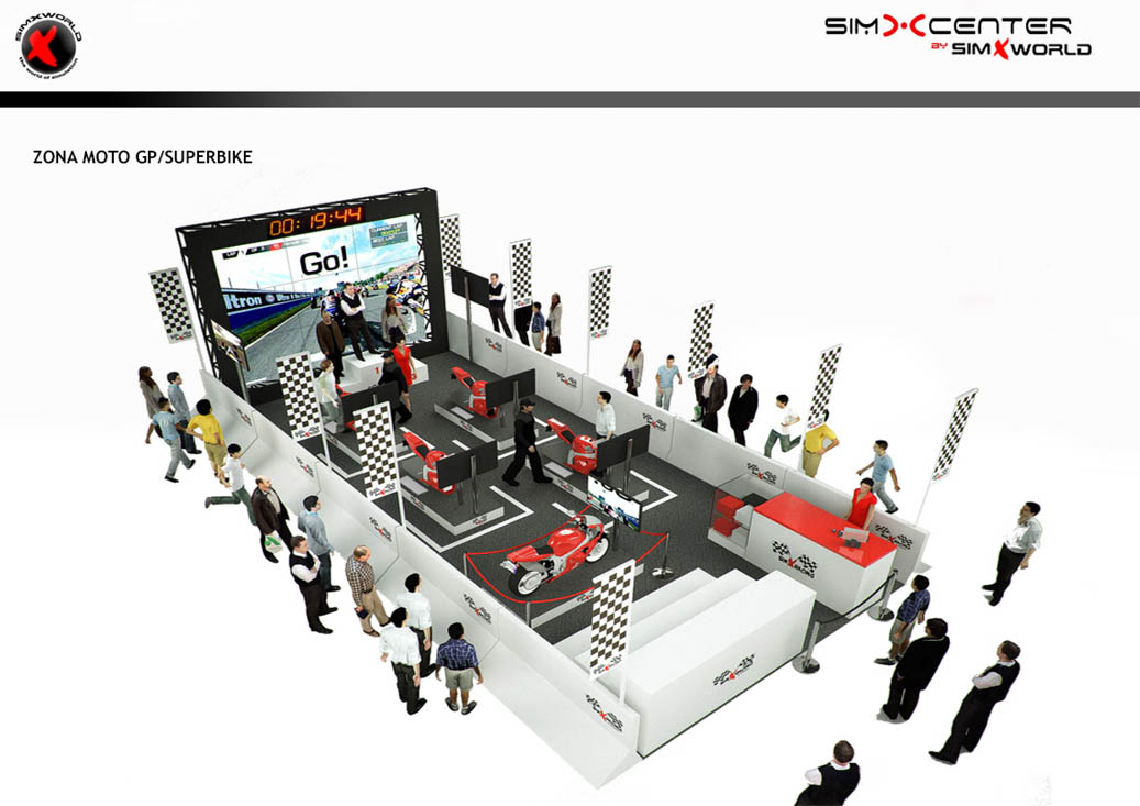 Infografía 3D para visualizar distintas opciones de SimXcenter o salas de ocio de tercera generación de la empresa líder mundial en simulación SimXworld. Consiste en la representación de un espacio dotado de los más realistas y modernos simuladores de competición de dos y cuatro ruedas que se pueden ver en toda Europa, donde el público podrá competir y practicar su afición sin ningún tipo de riesgos de manera totalmente inmersiva.