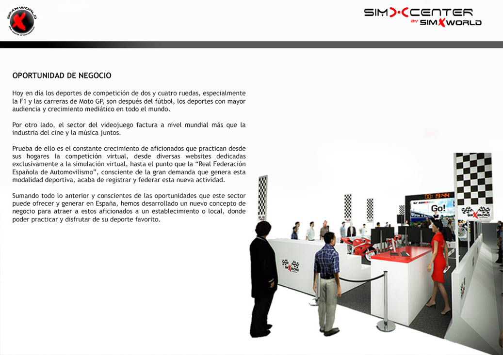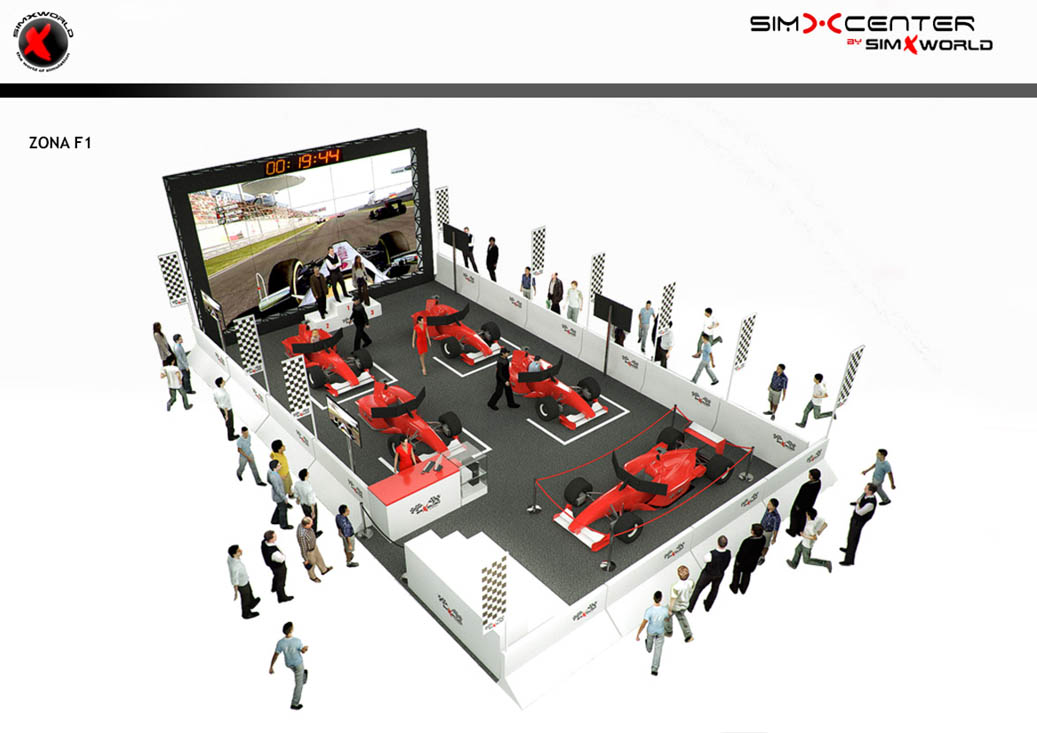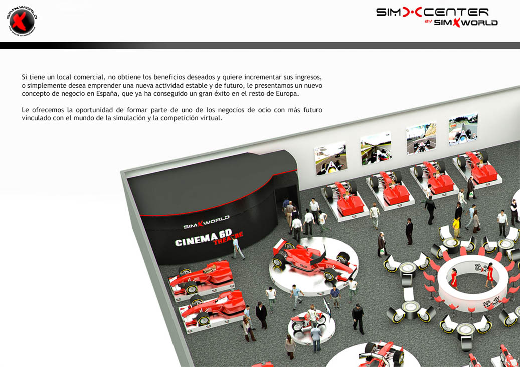 En este proyecto se trataba de representar mediante renders 3d del interior del proyecto las distintas opciones de salas de simulación dedicadas al ocio que ha puesto en marcha la empresa líder mundial en simulación SimXworld, se trata de unas salas recreativas en donde se puede disfrutar de una manera realista de lo que sienten los pilotos de Fórmula 1, Moto GP y Rally a través de unos simuladores inmersivos muy fieles a los vehículos originales mezclando un software de velocidad con movimientos realistas para conseguir una conducción inmersiva en los usuarios.