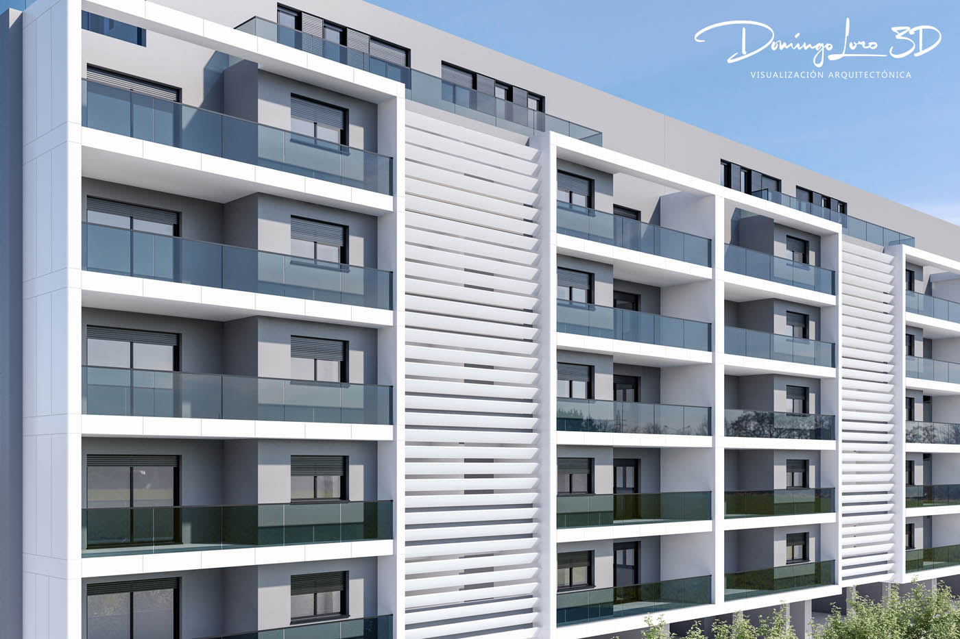 Render 3D de un edificio residencial en Madrid desarrollado para la comercialización de una promoción inmobiliaria. Somos un estudio especializado en renders de arquitectura 3D para la visualización y comercialización de todo tipo de proyectos inmobiliarios, arquitectónicos y de interiorismo en Madrid con casi dos décadas de experiencia profesional, trabajamos para clientes de toda España. Tenemos la mejor relación calidad precio del mercado.