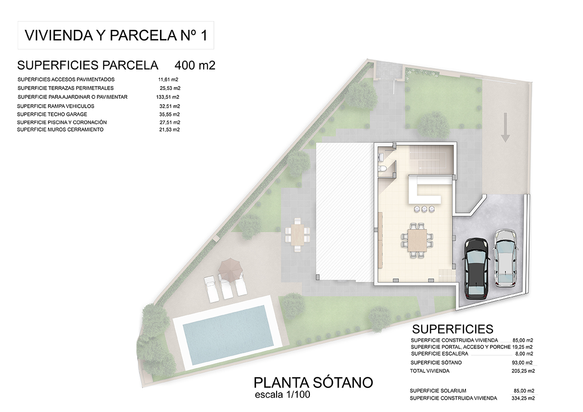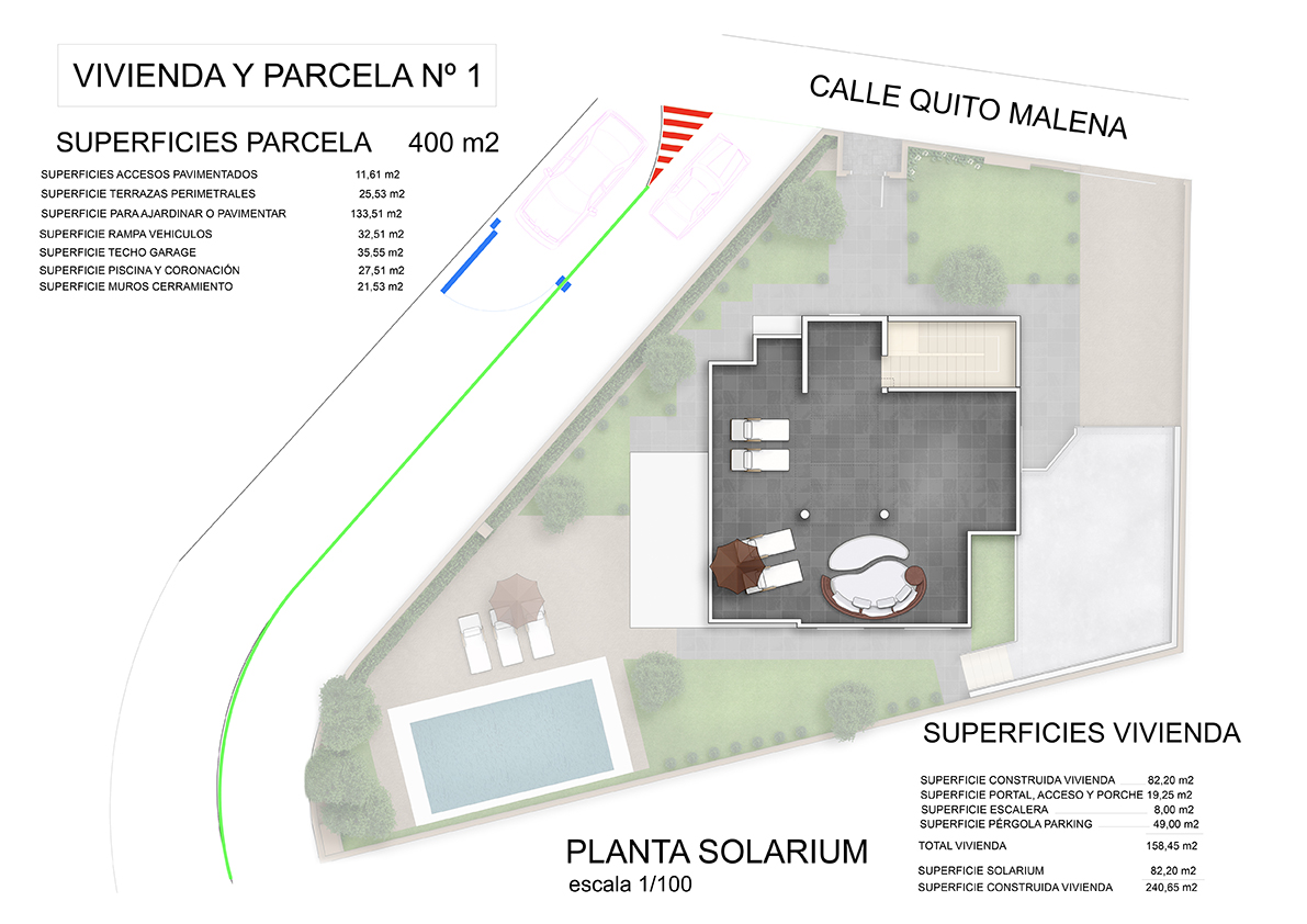 Planos de venta a color de una vivienda unifamiliar con parcela independiente para la comercialización de una promoción inmobiliaria