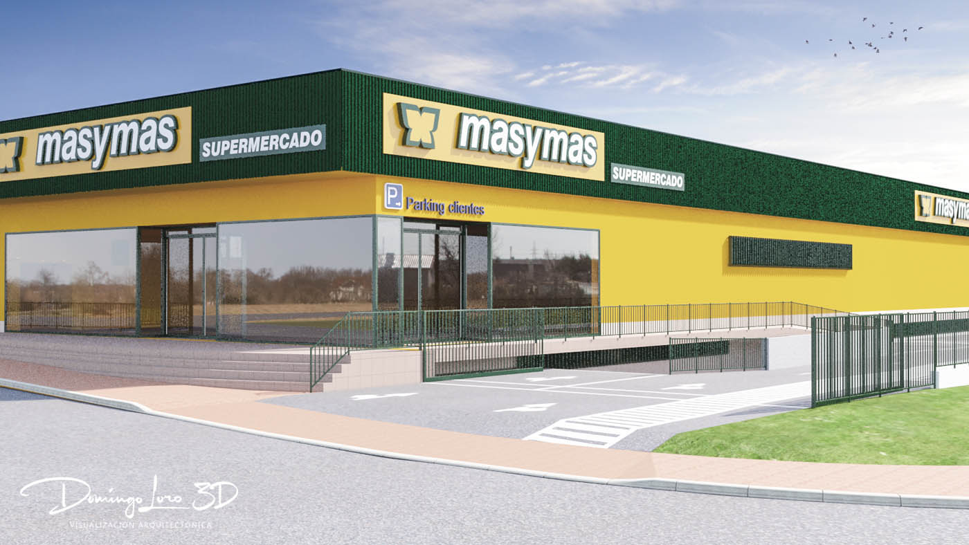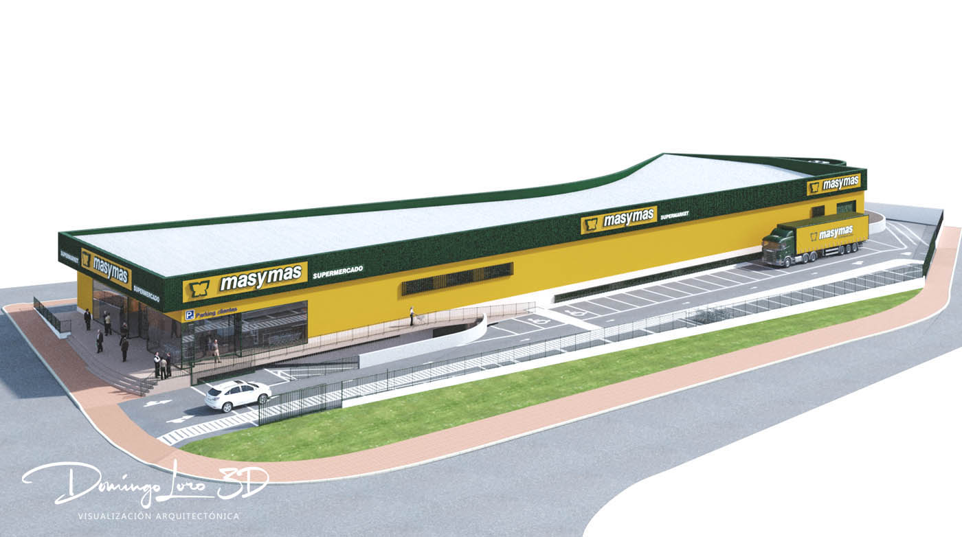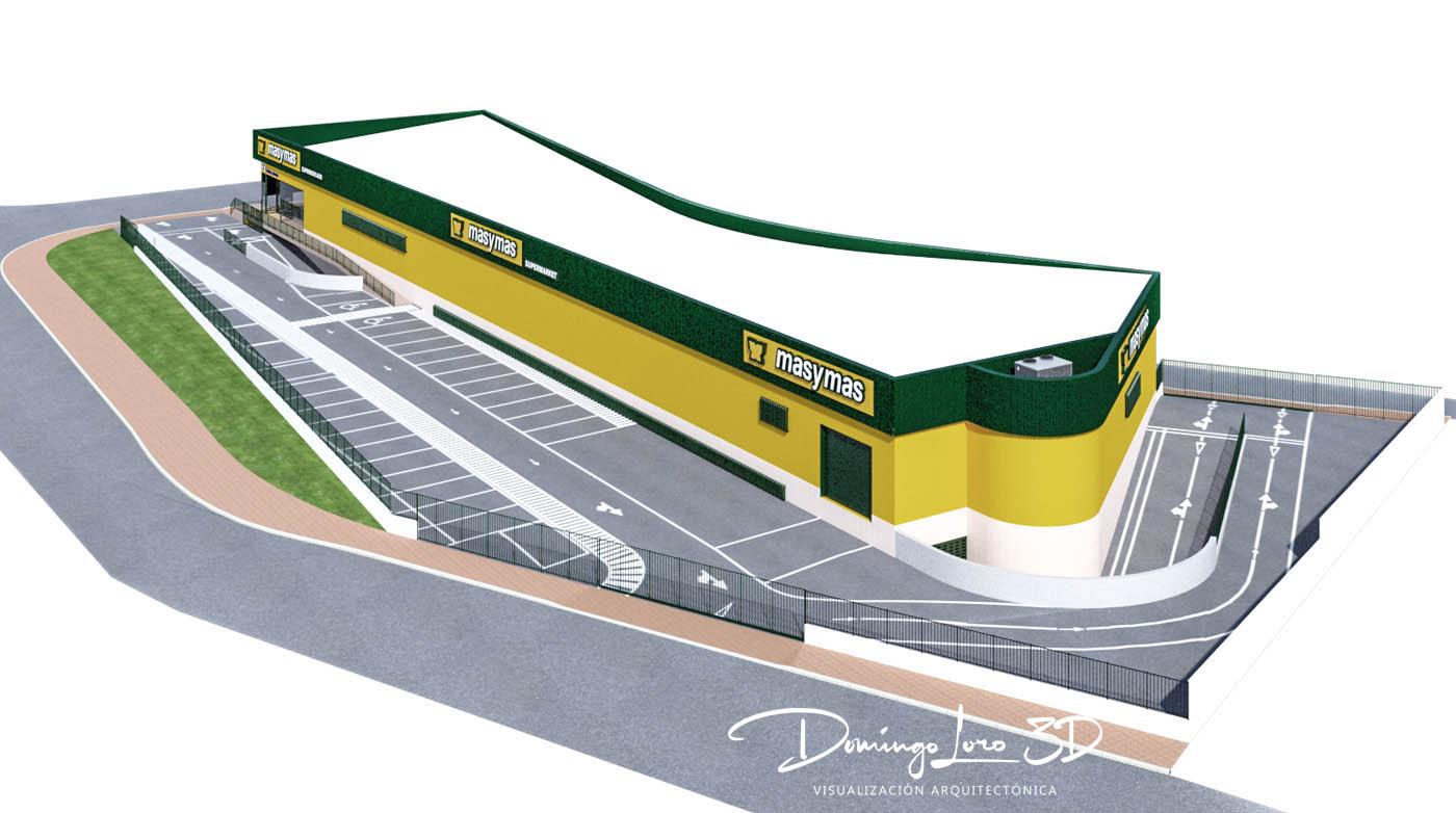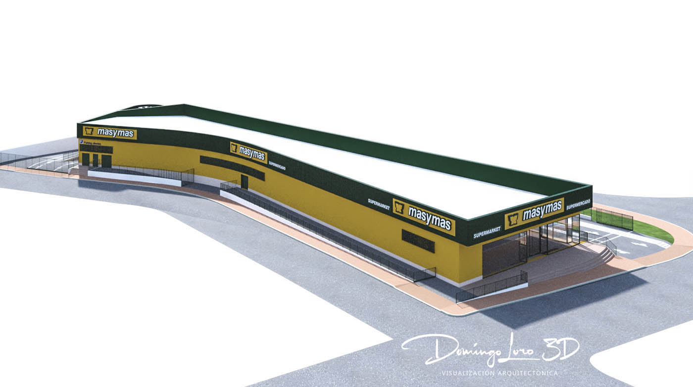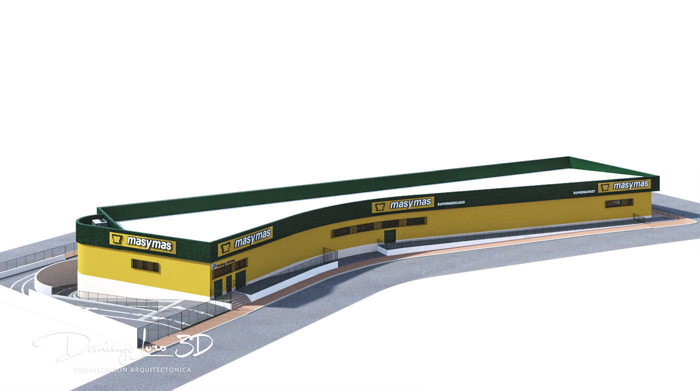 Las imágenes, a modo de maqueta 3D de un supermercado de la cadena masymas, que ilustran este artículo son un ejemplo de visualización 3D de un proyecto arquitectónico, una representación del exterior de un nuevo establecimiento de esta famosa cadena de supermercados en la que se pueden observar a través de varias imágenes como será el nuevo edificio y sus cuatro fachadas sirviendo como un buen ejemplo de visualización 3D de un proyecto arquitectónico.