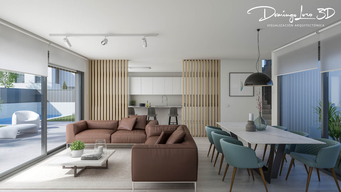 La infografía 3D fotorrealista que ilustra este artículo pertenece al interior de una vivienda adosada con parcela independiente en Navalmoral de la Mata, Cáceres, que se ha realizado con gran calidad, detalle y realismo junto con varias imágenes del interior y exterior del proyecto para el diseño de un dossier comercial de ventas que se usará para la comercialización de todo el proyecto.
