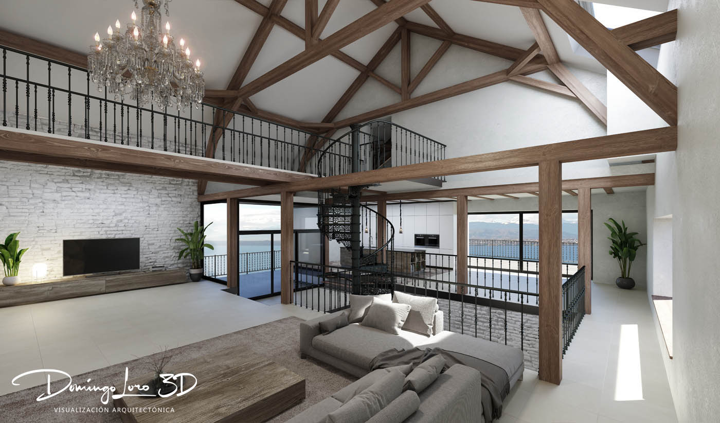 Este artículo muestra la infografía 3D de un espacio interior de la primera planta de una granja con varios siglos de historia en un entorno idílico frente al lago Lemán en Suiza que se va a rehabilitar de manera integral para su reconversión en vivienda realizado por un prestigioso interiorista internacional una infografía 3D perteneciente a un proyecto de interiorismo donde la calidad del mobiliario, así como su espacio y los distintos elementos, están representados con gran detalle y realismo con una resolución de imagen de 8K Ultra HD con un tamaño de 33 megapixels. Hemos realizado miles de recreaciones virtuales de interiores en ambientes con infografía 3D para arquitectos, interioristas, promotores inmobiliarios y clientes particulares de toda España. Para desarrollar recreaciones virtuales con infografía 3D de ambientes para la representación de interiores es necesaria una formación muy específica, gran capacidad de interpretación y diseño de espacios interiores, comprensión y conocimiento de los distintos elementos que componen la escena, experiencia y sobre todo calidad de render ya que se trata de visualizar, con mucha fidelidad y realismo, el interior 3D en cuestión para poder utilizar las imágenes como una eficaz herramienta de venta. El equipo de profesionales de nuestro estudio de infografía 3D reúne todas esas capacidades lo que nos permite afrontar cualquier tipo de representación de ambientes realizados con renders de interiores con gran calidad, realismo y una relación calidad y precio de las mejores del mercado.