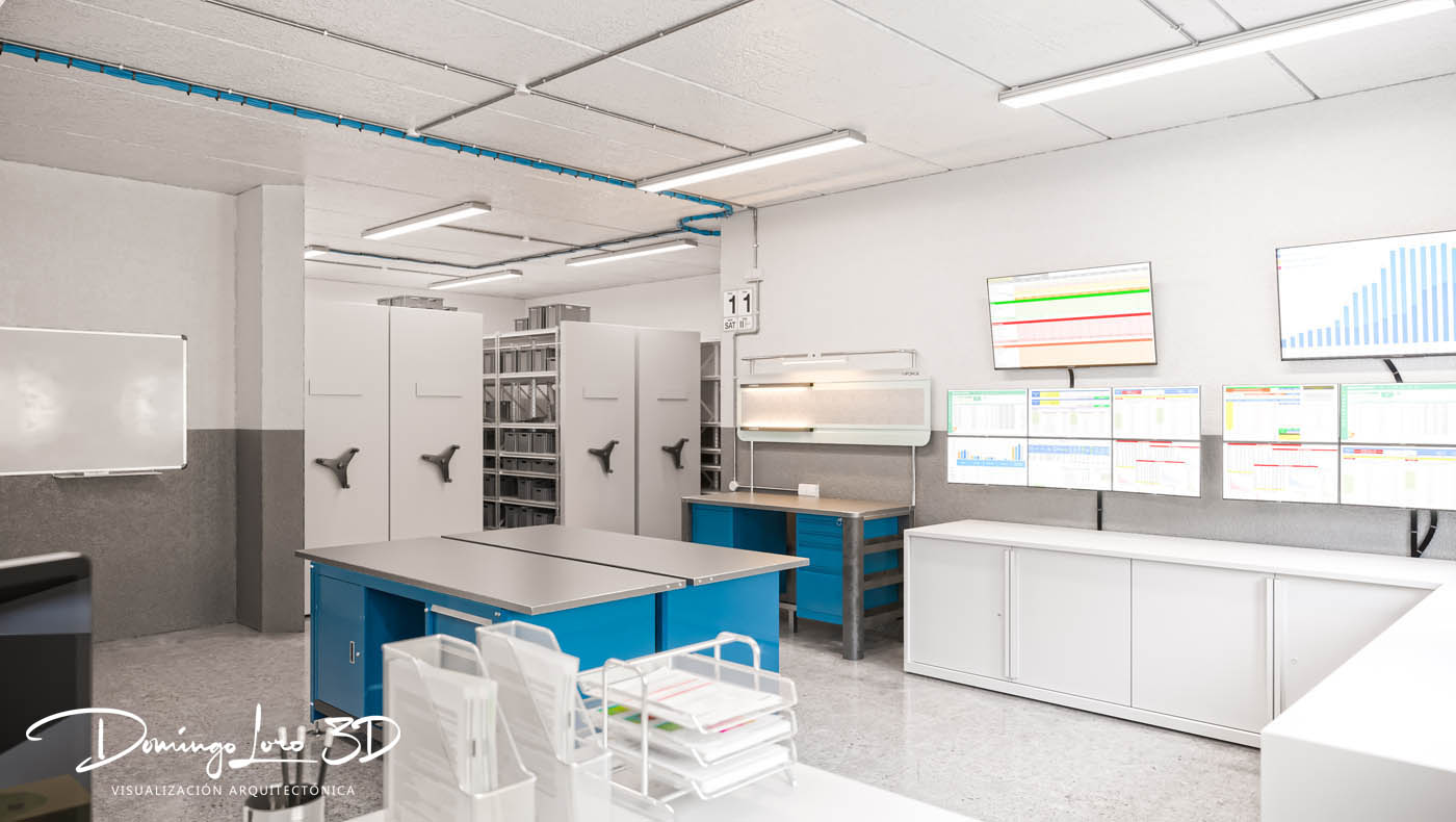 Con una infografía 3D de interiores se puede visualizar con gran calidad y realismo cualquier espacio interior. Esta infografía 3D del interior de la fábrica de HOFMANN © en Valencia muestra un espacio destinado a archivo y monitorización general de procesos dentro de la fábrica.