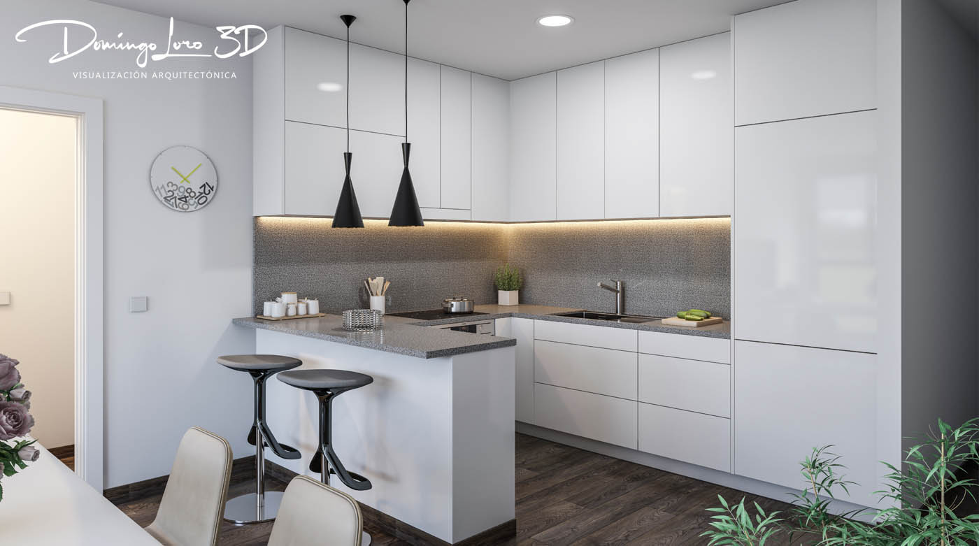En muchas ocasiones cuando una empresa de cualquier parte de España contacta con nosotros para la realización de un proyecto con renders 3D para la comercialización de una promoción inmobiliaria nos comenta que les gustaría hacer unas vistas del interior de alguna de las viviendas, nosotros siempre aconsejamos realizar las cuatro estancias principales del inmueble como son: salón comedor, cocina, dormitorio y baño ya que con la representación de estos espacios se visualiza, en su práctica totalidad, la vivienda a comercializar consiguiendo unas imágenes de alto impacto visual con gran calidad, detalle y realismo. Con renders de interiores 3D en alta resolución se aprecian los materiales, mobiliario, iluminación y todo tipo de detalles en la escena para favorecer la comprensión de los espacios por parte de los clientes interesados en la compra de la vivienda.