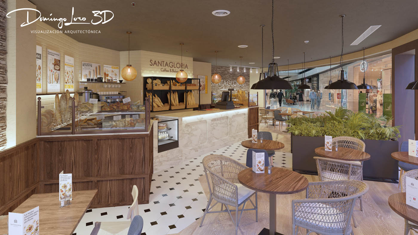 Renders 3D de una franquicia de Santagloria Coffee & Bakery