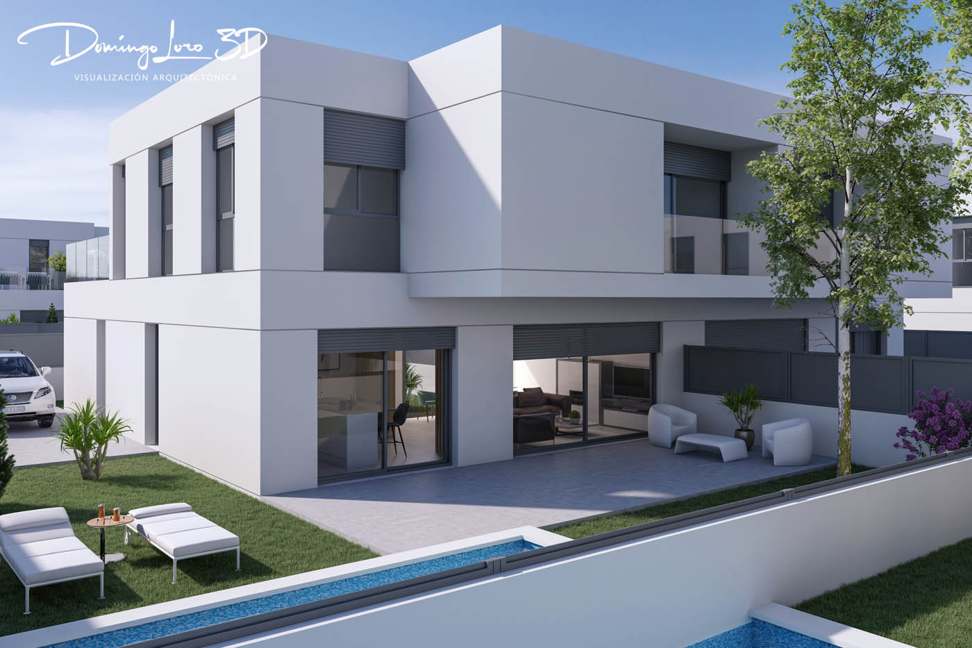 Renderizado 3D de una urbanización de viviendas adosadas realizado para la comercialización de una promoción inmobiliaria en Navalmoral de la Mata, Cáceres, renders de arquitectura 3D realizados con infografía 3D para la representación y comercialización de todo tipo de proyectos inmobiliarios, imágenes digitales en alta resolución con gran calidad, detalle y realismo para visualizar promociones inmobiliarias realizadas mediante recreaciones virtuales. Renderizado 3D de proyectos de arquitectura ideales para su visualización y comercialización. Somos profesionales en recreaciones virtuales realizadas con infografía 3D para la venta de promociones inmobiliarias con amplia experiencia en el sector.