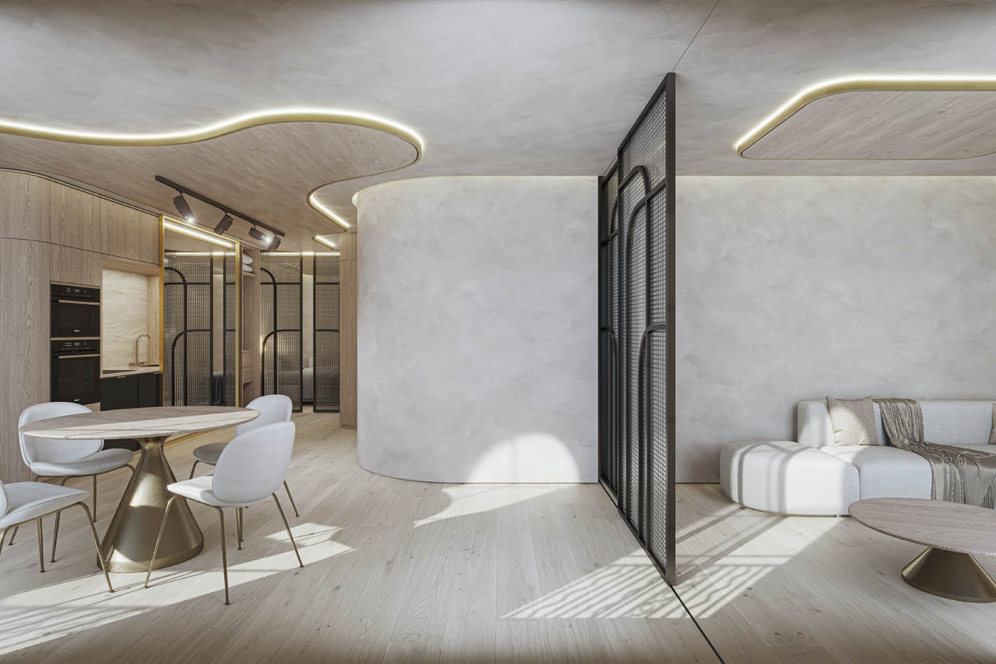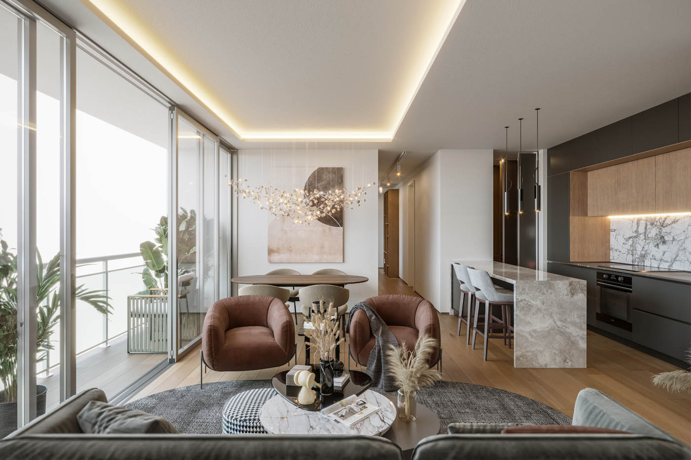 Renders 3D de los espacios interiores de un apartamento, desarrollados con infografía 3D para la comercialización de una promoción inmobiliaria. Los renders 3D de interiores permiten visualizar todo tipo de espacios de manera realista a través de la creación de imágenes digitales en alta resolución controlando aspectos como puntos de vista, materiales, texturas e iluminación. Una herramienta para decoradores, interioristas y arquitectos para comunicar sus proyectos. Salón comedor, cocina, dormitorio y cuarto de baño con los acabados que tiene este apartamento. ¡Hable con nosotros y compruebe nuestros resultados!