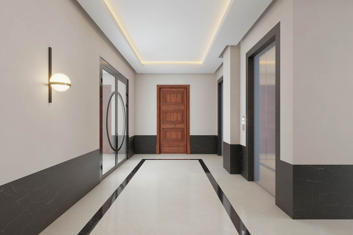 Infografía 3D del zaguán de un edificio residencial en el madrileño Barrio de Salamanca. Normalmente este tipo de espacios no es habitual representarlos con infografía 3D para la comercialización de una promoción inmobiliaria pero cada vez es más habitual realizar renders 3D para clientes particulares y representar proyectos de todo tipo como es el caso de las imágenes que ilustran este artículo realizadas para una comunidad de vecinos, ya que este hecho facilita a los propietarios del inmueble todo tipo de información gráfica del mismo. La comunidad de vecinos ha contado con nosotros para la visualización 3D de la futura obra.