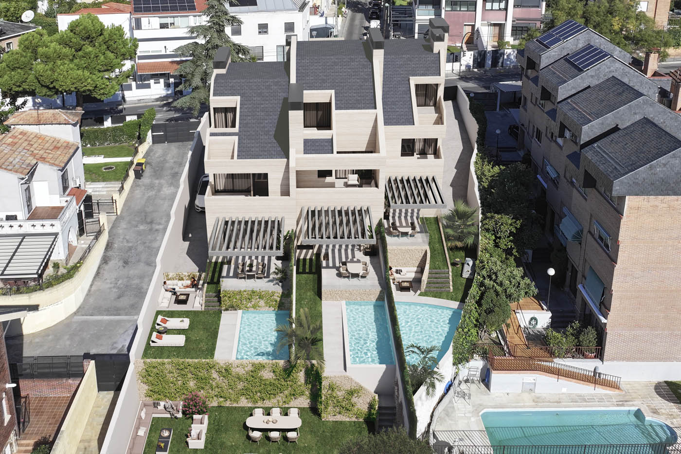 Infografías 3D del exterior e interior de una promoción inmobiliaria en Pozuelo de Alarcón, Madrid, varias recreaciones virtuales 3D del proyecto realizadas para la comercialización de este conjunto de tres viviendas adosadas. Representación de viviendas adosadas centrándose en los jardines y terrazas mediante imágenes digitales en alta resolución realizadas con infografía 3D. Somos una empresa especializada en el desarrollo de renders 3D de arquitectura para la visualización y comercialización de todo tipo de proyectos con 25 años de experiencia trabajando para clientes de toda España. Miles de proyectos realizados en todo el territorio nacional.