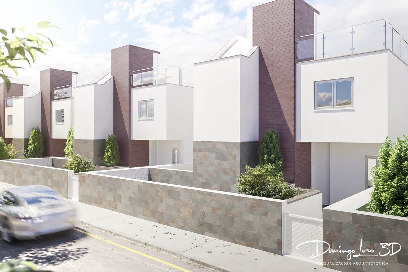 Recreación virtual de una urbanización de viviendas adosadas, un render de arquitectura 3D realizado con infografía para la visualización de un conjunto de viviendas adosadas. Realizamos renders con infografía 3D de gran realismo y alto impacto visual para la representación de promociones inmobiliarias para empresas de toda España, recreaciones virtuales 3D en alta resolución para la comercialización de todo tipo de proyectos inmobiliarios con la mejor relación: tiempos de entrega, calidad y precio del mercado. ¡Contacte con nosotros, llame ahora e infórmese!
