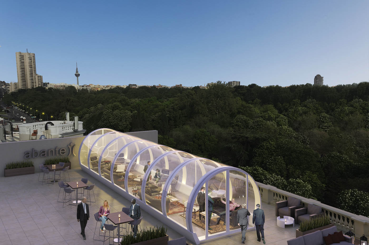 Infografía 3D de una terraza en el centro de Madrid, junto a la Puerta de Alcalá y frente al Parque del Retiro, hace algún tiempo publicamos un curioso proyecto que consistía en la instalación de una estructura tubular de aluminio y cristal que servía de terraza veraniega para los inviernos de un frio país del norte de Europa. En este caso este mismo producto, con multitud de usos, va a instalarse en la céntrica terraza de las oficinas de un importante grupo de asesores financieros en la capital de España.