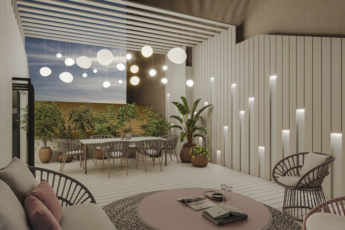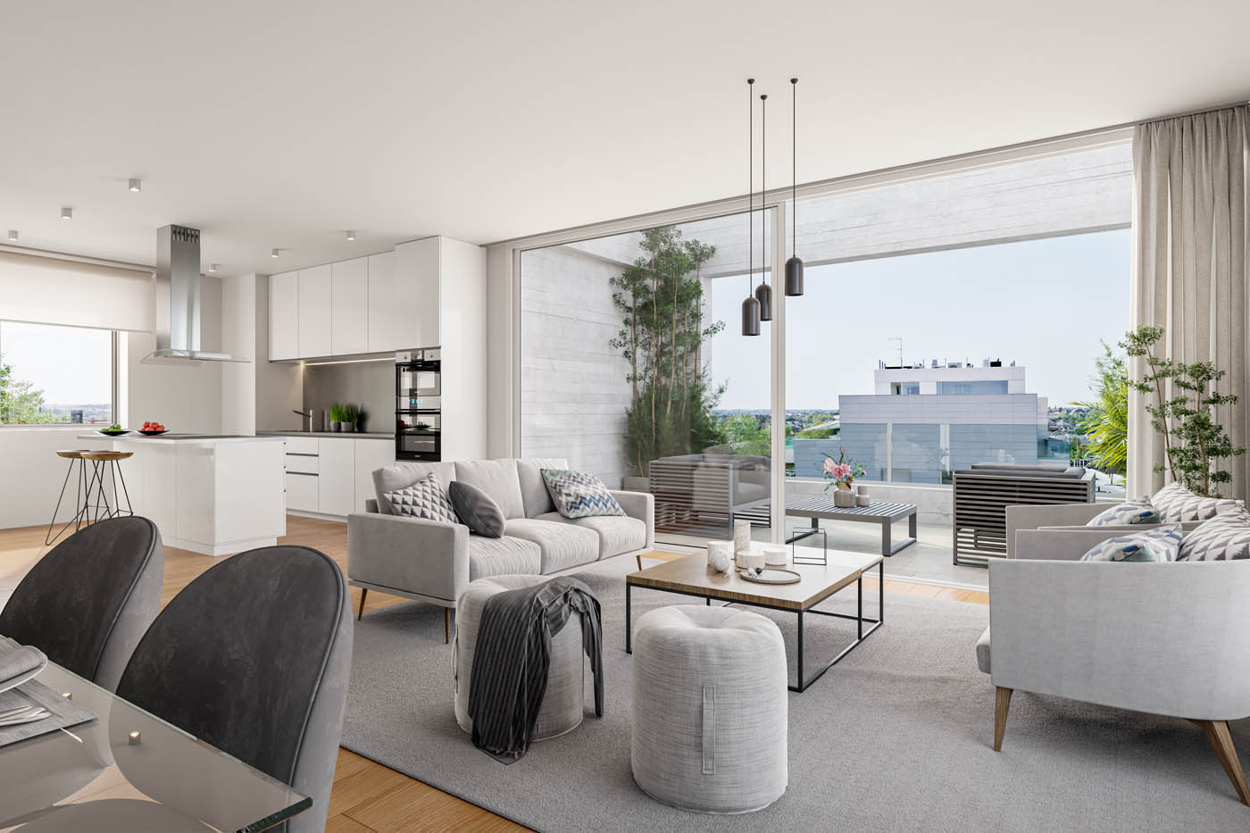 Renders 3D de los espacios interiores de un espectacular ático en Aravaca, Madrid, desarrollados con infografía 3D para la comercialización de una promoción inmobiliaria. Los renders 3D de interiores permiten visualizar todo tipo de espacios de manera realista a través de la creación de imágenes digitales en alta resolución 8K Ultra HD creadas por ordenador con infografía 3D controlando aspectos como puntos de vista, materiales, texturas e iluminación. Una herramienta para decoradores, interioristas y arquitectos para comunicar sus proyectos. Diferentes estancias y terraza solarium que representan los espacios principales y muestran los acabados principales que tiene este estupendo ático. ¡Hable con nosotros y compruebe nuestros resultados!