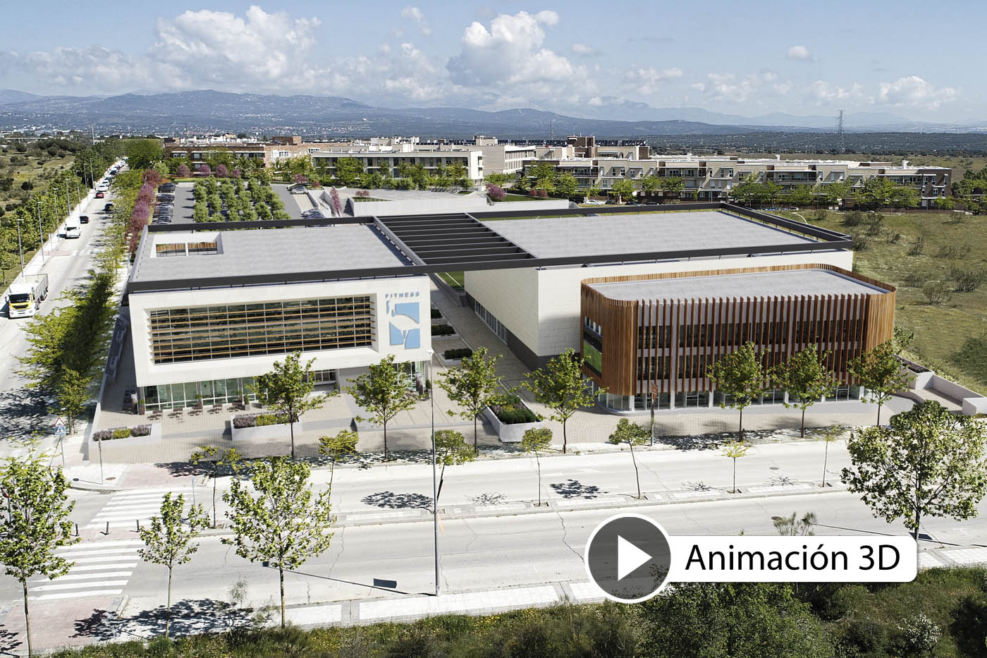 Animación 3D de una obra pública desarrollados para la visualización de un centro deportivo y cultural en Las Rozas de Madrid, la Concejalía de Deportes del Ayuntamiento de Las Rozas, ha confiado de nuevo en nuestra empresa para el desarrollo de este magnífico proyecto. El complejo contará con campo de hockey, pabellón deportivo, tres piscinas, zona fitness y musculación, y un edificio cultural. Será un complejo sostenible, con amplios espacios abiertos, grandes zonas verdes y plenamente accesible. Se han realizado renders 3D de difentes puntos de vista con imágenes integradas en fotografías aéreas realizadas con un dron y una espectacular presentación audiovisual con animación 3D con recorridos virtuales por el futuro centro deportivo y cultural.