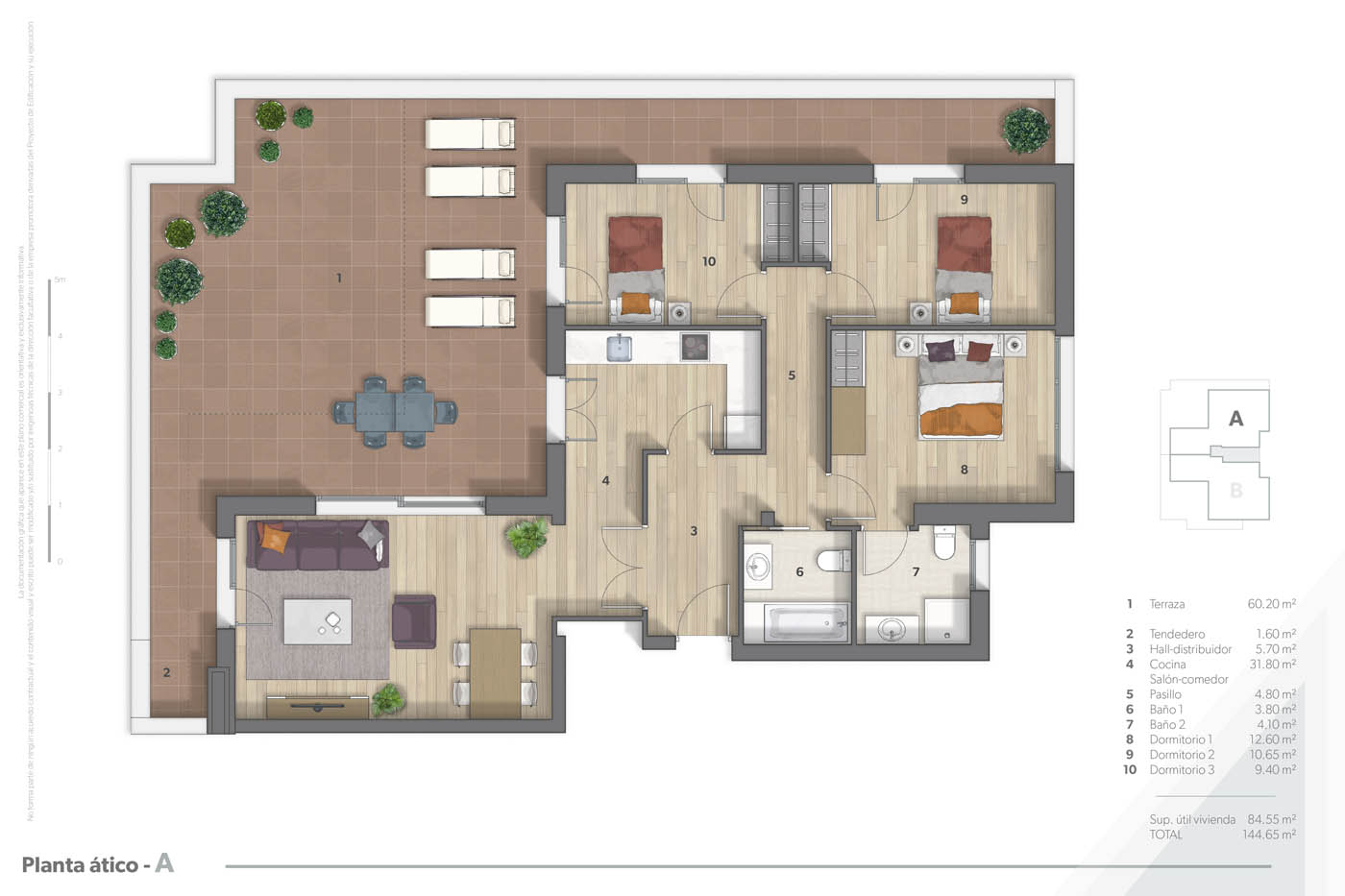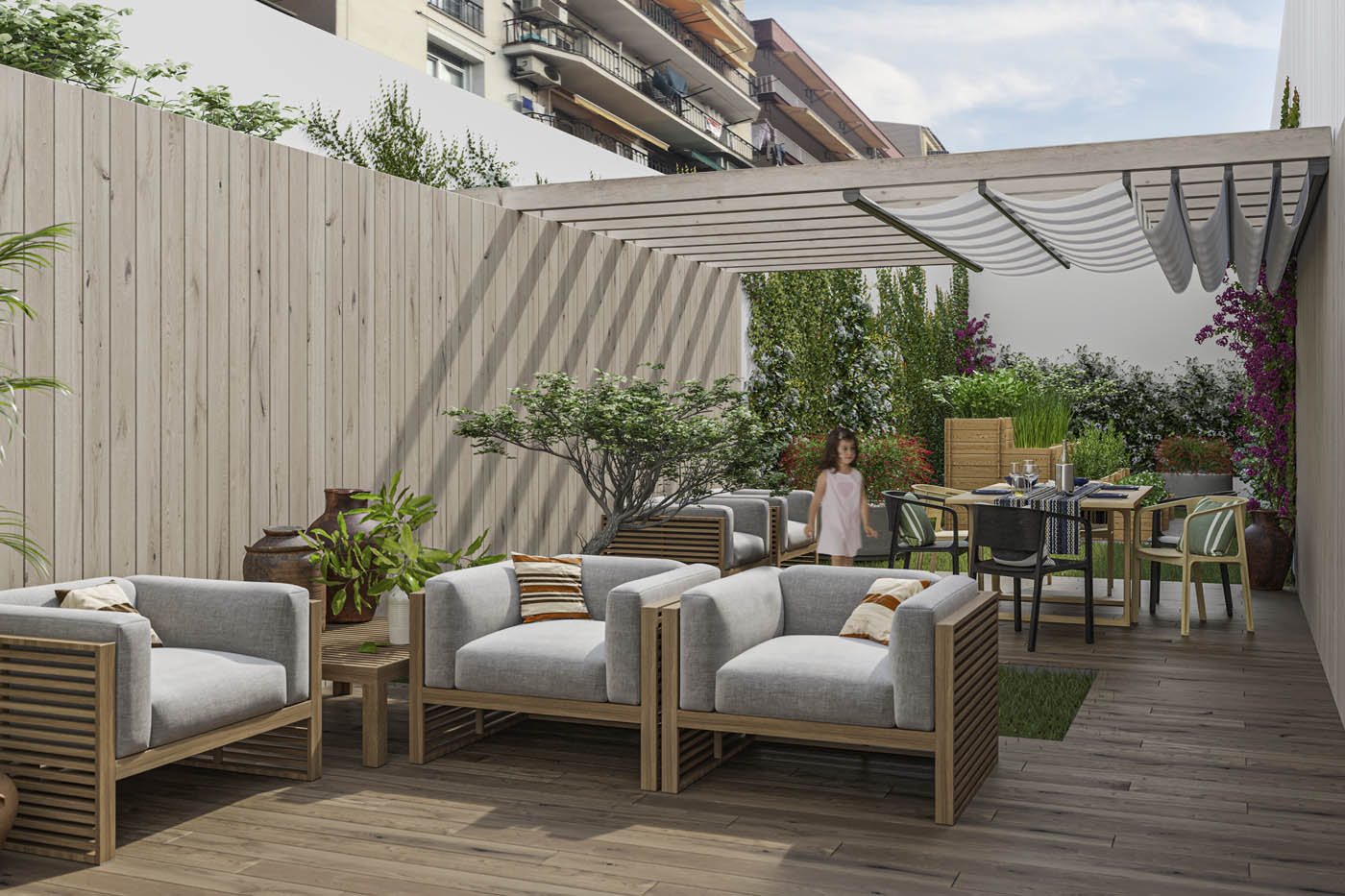 Render 3D de la terraza interior de una vivienda en planta baja de un edificio plurifamiliar en Barcelona realizado con infografía 3D para la visualización del acondicionamiento de este espacio exterior para la comercialización de una promoción inmobiliaria. Una propuesta decorativa para potenciar el valor comercial de esta promoción inmobiliaria de un edificio pllurifamiliar junto a Plaza de España. Llevamos más de 20 años desarrollando renders 3D de gran realismo para todo tipo de proyectos urbanísticos, arquitectónicos e inmobiliarios para empresas de toda España con la mejor relación calidad y precio de mercado. Contacte con nosotros e infórmese. Trabajamos con infinidad de empresas en Barcelona y toda Cataluña realizando renders 3D de arquitectura e interiorismo.
