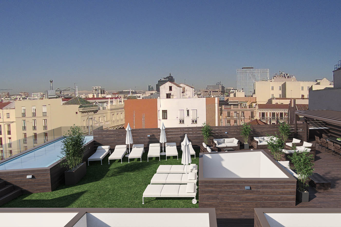 Render 3D de una terraza de estilo "chill out" con piscina en la cubierta de un edificio en calle Hermosilla en pleno corazón del Barrio de Salamanca en Madrid. Realizamos renders de arquitectura 3D para la recreación virtual de todo tipo de villas, viviendas, pisos, apartamentos e inmuebles de alto standing. Somos profesionales en renders 3D de proyectos de arquitectura e interiorismo ideales para su visualización y comercialización con amplia experiencia que trabajamos para empresas de toda España representando, mediante infografía 3D, proyectos inmobiliarios de todo tipo. Hable con nosotros y compruebe nuestros resultados, tenemos la mejor relación calidad y precio del mercado ofreciendo un trato profesional, cercano y de máxima calidad en todas las fases del desarrollo.