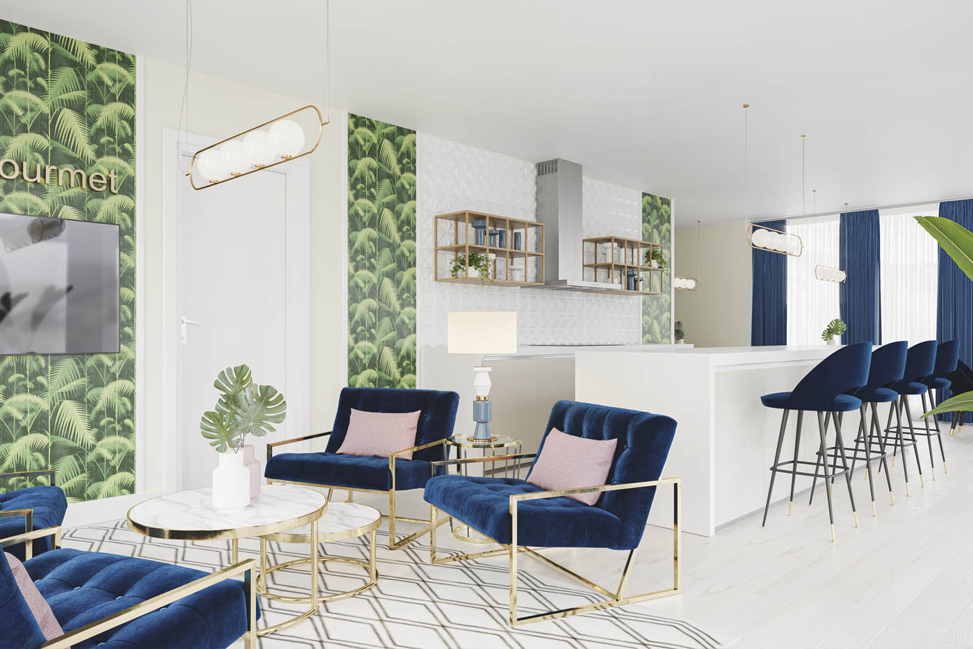 Estos renders 3d de los interiores de las zonas comunes de un complejo urbanístico residencial en Estepona, Málaga, se han desarrollado para la visualización y comercialización de una promoción inmobiliaria, varias recreaciones virtuales y planos comerciales con gran calidad, detalle y realismo de una sala gourmet y gimnasio. Con renders 3D se pueden conseguir impactantes imágenes de cualquier proyecto mucho antes de realizar la obra del mismo. Hoy en día se realizan renders 3D para todo tipo de proyectos, ya sean grandes promociones inmobiliarias o pequeños proyectos arquitectónicos, trabajamos para todo tipo de profesionales y empresas de toda España con la mejor relación calidad y precio del mercado. Somos profesionales con más de 20 años de experiencia en el sector con miles de proyectos realizados. ¡Llame ahora e infórmese!