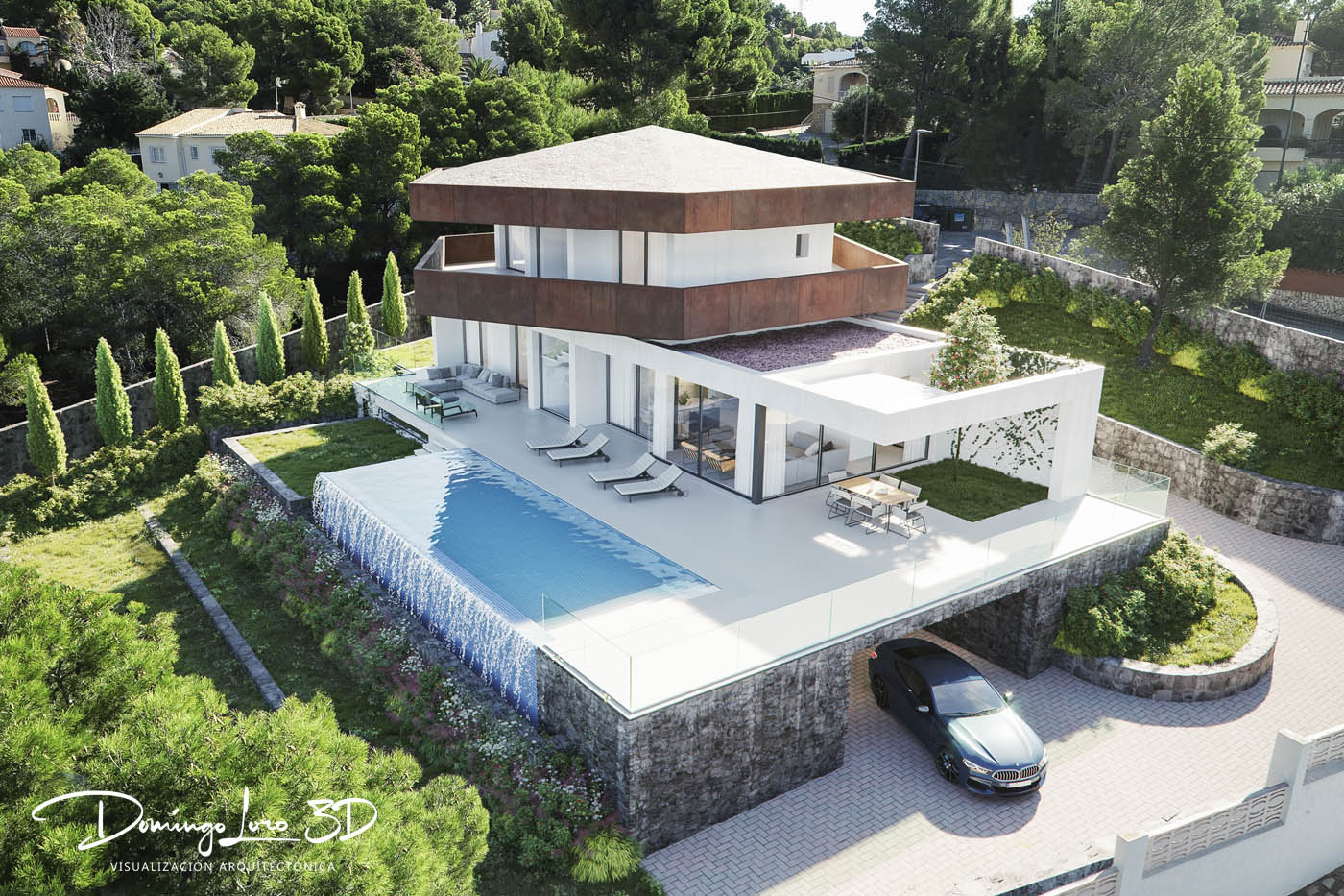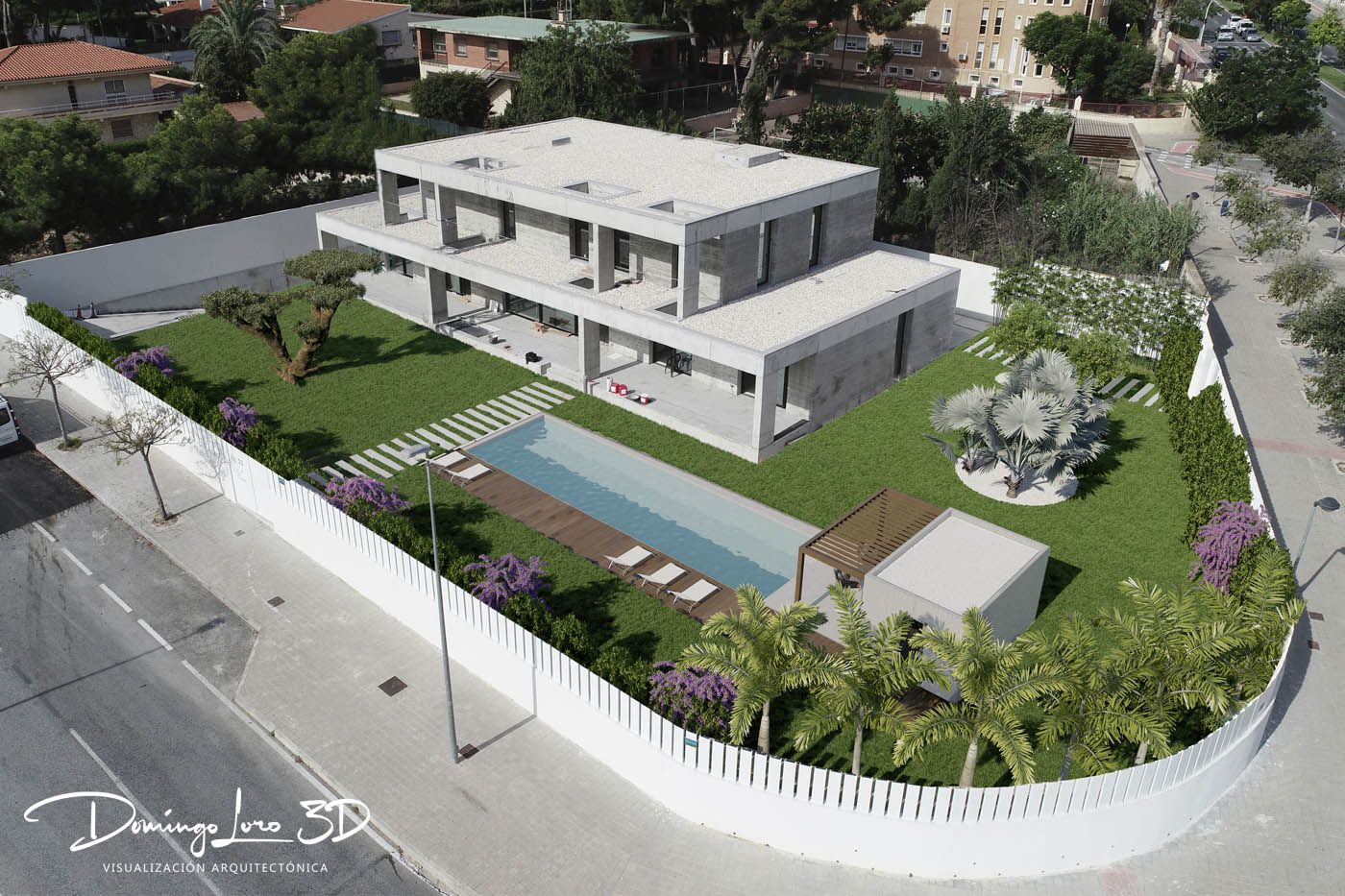 Renders 3D de un proyecto de ajardinamiento y paisajismo a vista de dron en una vivienda unifamiliar con parcela independiente. Una visualización 3D con varios renders 3D integrados sobre fotografías aéreas realizadas con un dron para mostrar un resultado, totalmente realista, de como quedará el proyecto una vez realizada la obra y el ajardinamiento de la parcela que conforma el proyecto. Realizamos renders 3D integrados sobre fotografías aéreas a vista de dron de todo tipo de proyectos. Somos pilotos profesionales y empresa acreditada por AESA (Agencia Española de Seguirdad Aérea) en fotografía y vídeo con drones y hacemos renders realizados con infografía 3D. Si desea realizar un proyecto con estas características, llame ahora y hable con nosotros. Tenemos 20 años de experiencia y la mejor relación calidad, precio del mercado.