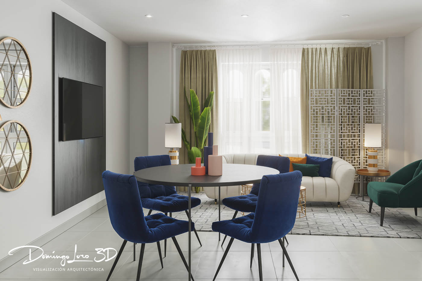 Renders 3D de salón, comedor y cocina de una vivienda unifamiliar realizados con infografía 3D para la comercialización de una promoción inmobiliaria. Estas tres estancias son representadas habitualmente para venta inmobiliaria ya que representan los espacios más importantes de una vivienda y sirven para comprender con gran detalle las características del inmbueble a comercializar. Renders de interiores 3D con gran calidad, detalle y realismo con la mejor relación calidad y precio del mercado. Nuestra metodología de trabajo contrastada durante 20 años de experiencia nos permite trabajar desde la distancia, sea donde sea, para clientes de toda España con todas las garantías. Si está pensando en la comercialización de una promoción inmobiliaria en cualquier punto del territorio nacional, hable con nosotros, podemos ayudarle a conseguir la mejor imagen para la comercialización de su proyecto.