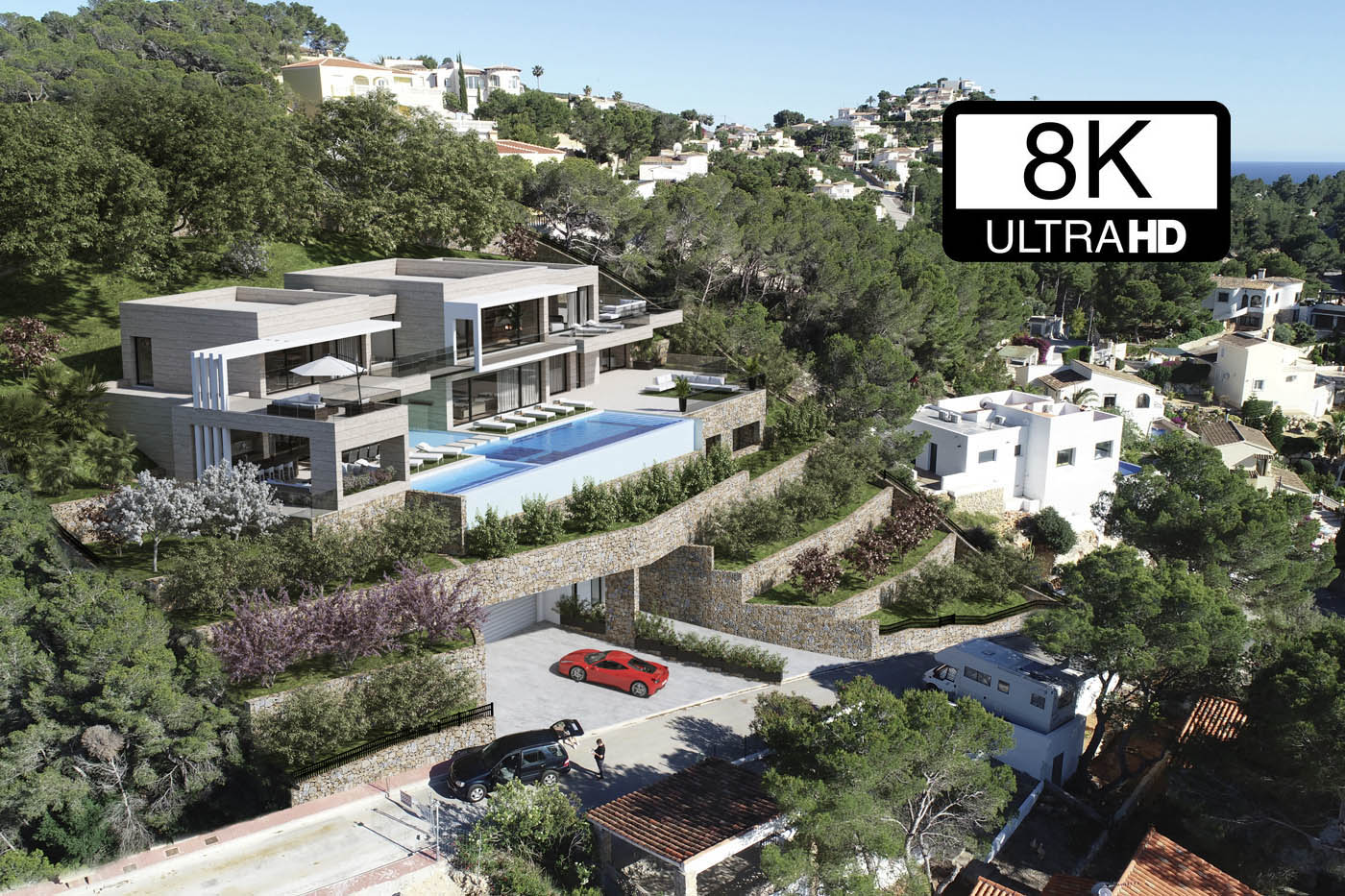 Renders de arquitectura exteriores e interiores de una villa de super lujo en Moraira, Alicante, realizados a resolución 8K Ultra HD, creamos renders de arquitectura para la representación de todo tipo de villas, viviendas e inmuebles de alto standing para empresas de toda España. Somos profesionales con 20 años de experiencia en la visualización 3D de este tipo de inmuebles, trabajamos para empresas de todo el territorio nacional representando, con infografía 3D, viviendas de lujo de todo tipo. Esta villa de super lujo en Moraira ha sido representada de manera exterior e interior con gran calidad, detalle y realismo a resolución 8K Ultra HD. Hable con nosotros y compruebe nuestros resultados, tenemos la mejor relación calidad, precio y plazos de entrega del mercado ofreciendo un trato profesional y de máxima calidad en todas las fases del desarrollo.