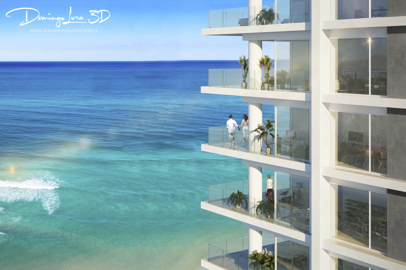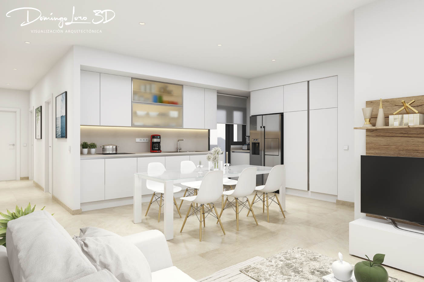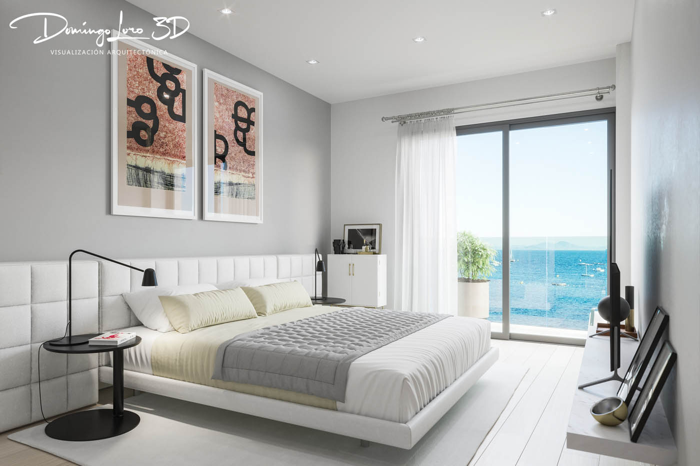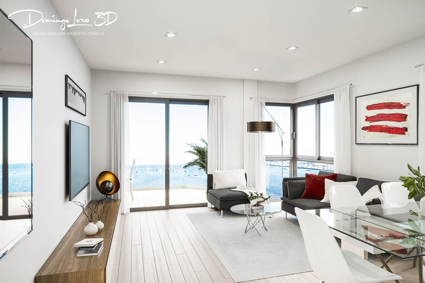 Renders 3D de los interiores de una vivienda en primera línea de mar realizados para la comercialización de una promoción inmobiliaria en Murcia. Interiores de una de las tipologías de vivienda: salón, cocina y dormitorio realizados con infografía 3D. Estos renders 3D son los representados habitualmente para la comercialización de promociones inmobiliarias ya que se visualizan las habitaciones más importantes de una vivienda y sirven para comprender con gran detalle las características del inmueble a comercializar por parte de los clientes interesados en la promoción. Nuestra metodología de trabajo, contrastada durante 20 años de experiencia, nos permite trabajar desde la distancia para empresas de toda España con todas las garantías.