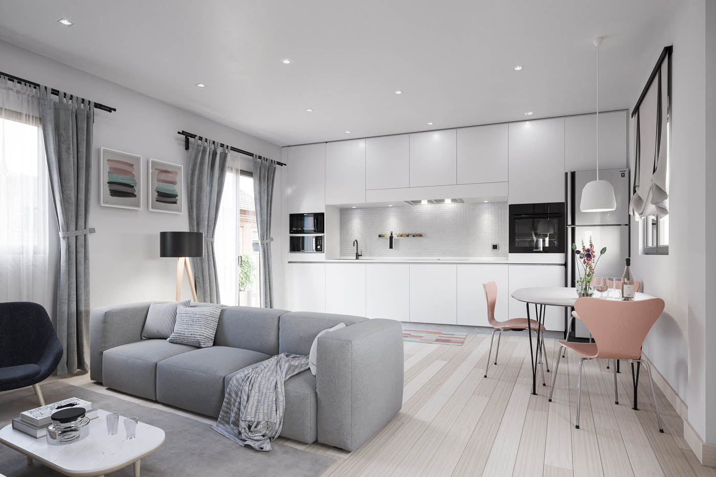 Render 3D de salón, comedor y cocina de un apartamento turístico realizado con infografía 3D para la comercialización de una promoción inmobiliaria. Este tipo de recreaciones virtuales para venta inmobiliaria sirven para representar los espacios más importantes de una vivienda y sirven para comprender con gran detalle las características del inmbueble a comercializar. Renders de interiores 3D con gran calidad, detalle y realismo con la mejor relación calidad y precio del mercado. Nuestra metodología de trabajo contrastada durante 20 años de experiencia nos permite trabajar desde la distancia, sea donde sea, para clientes de toda España con todas las garantías. Si está interesado, no lo dude, contacte con nosotros y compruebe nuestros resultados.