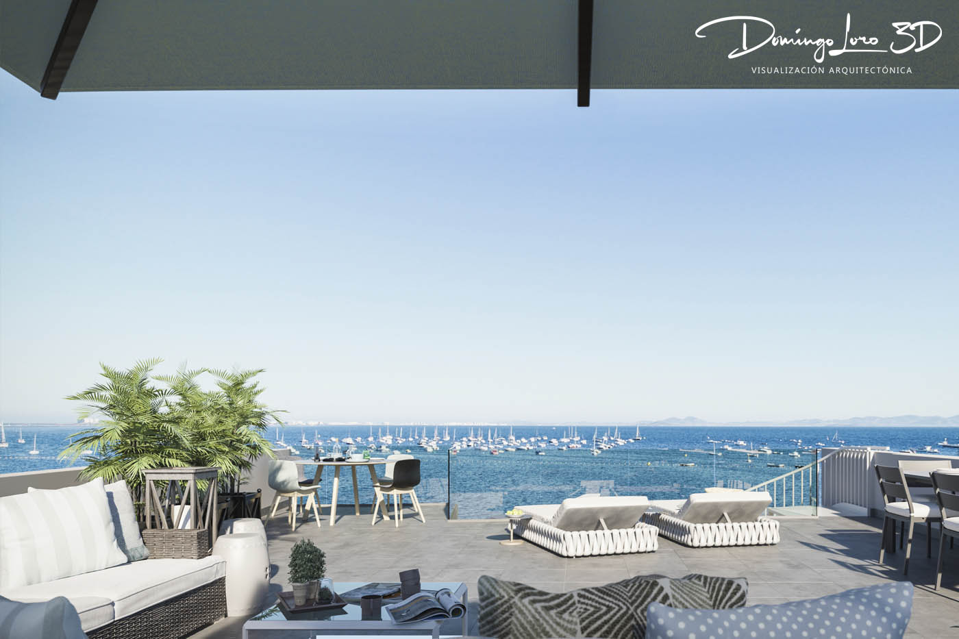Renders 3D de los solariums con vistas panorámicas de dos viviendas en primera línea de Mar Menor con fantásticas vistas cuyas fotografías para las vistas han sido realizadas con un dron desde la altura y punto exacto donde estarán una vez ejecutada la obra. Los renders 3D y fotografías con drones son la combinación perfecta para conseguir imágenes de alto valor comercial y enorme realismo. Renders de arquitectura 3D realizados para la comercialización de un edificio residencial con espectaculares solariums en primera línea de Mar Menor en Murcia. Representamos proyectos con renders 3D de gran realismo para empresas de toda España de todo tipo de proyectos de interiorismo y promociones inmobiliarias.