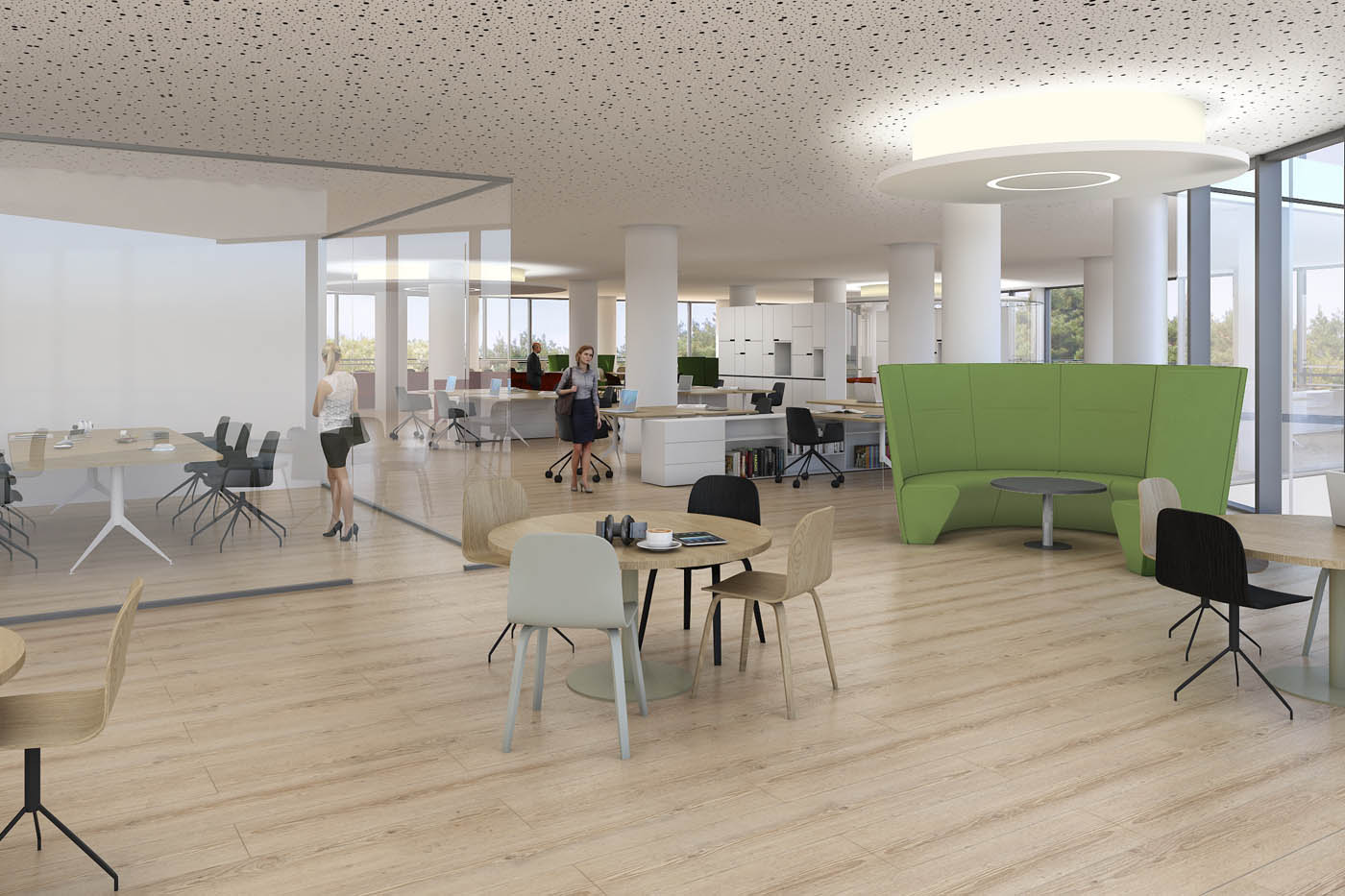 Renders 3D de las oficinas de una importante empresa multinacional del sector farmacéutico. Un proyecto que muestra los nuevos espacios laborales de estas grandes empresas, espacios de trabajo compartido, salas de reuniones en espacios abiertos, distintas zonas de trabajo, estancias inundadas de luz natural, cafetería integrada. El número de instalaciones de estas características no para de crecer y cada vez hay más oficinas de este estilo implantadas en empresas por todo el mundo. Los renders 3D que ilustran este artículo son un buen ejemplo de renders 3D del interior de unas oficinas en un edificio del campus de una importante empresa farmacéutica multinacional. Somos profesionales en infografía 3D con 20 años de experiencia trabajando para empresas de toda España.