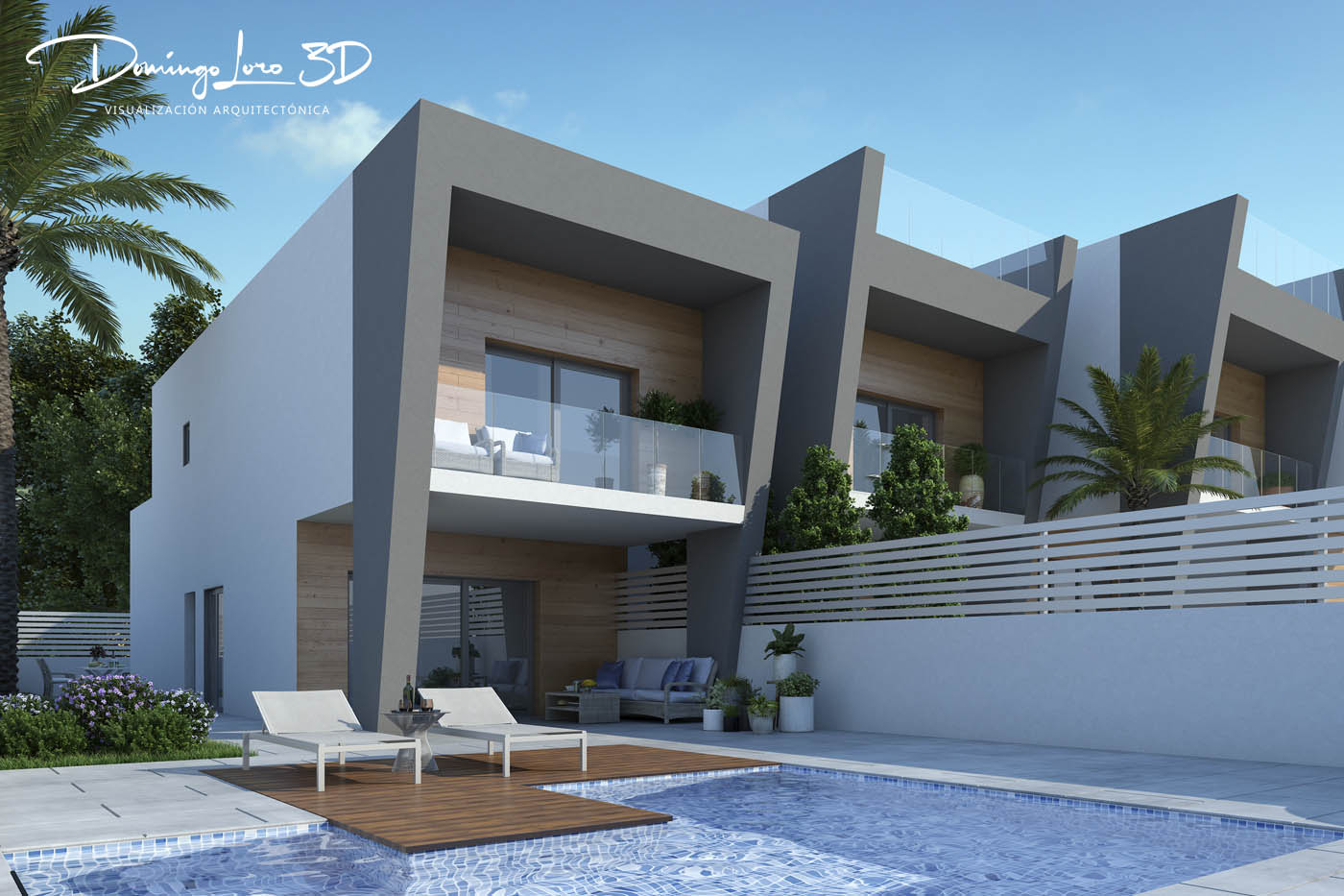 Renders 3D de un conjunto de viviendas adosadas en San Pedro del Pinatar, Murcia, llevamos veinte años de actividad profesional realizando proyectos de visualización arquitectónica por toda la Región de Murcia. Renders de arquitectura 3D en Murcia para estudios de arquitectura, interiorismo, inmobiliarias, empresas promotoras y clientes particulares de todo tipo. Estos renders 3D en San Pedro del Pinatar representan una atractiva urbanización de viviendas adosadas. Si está interesado en la comercialización de una promoción inmobiliaria en cualquier parte de España llámenos y compruebe nuestros resultados, tenemos la mejor relación calidad y precio. Somos profesionales con amplia experiencia en marketing inmobiliario.