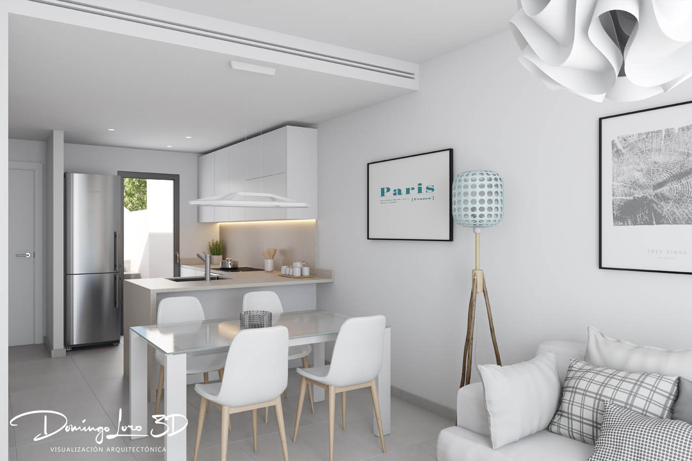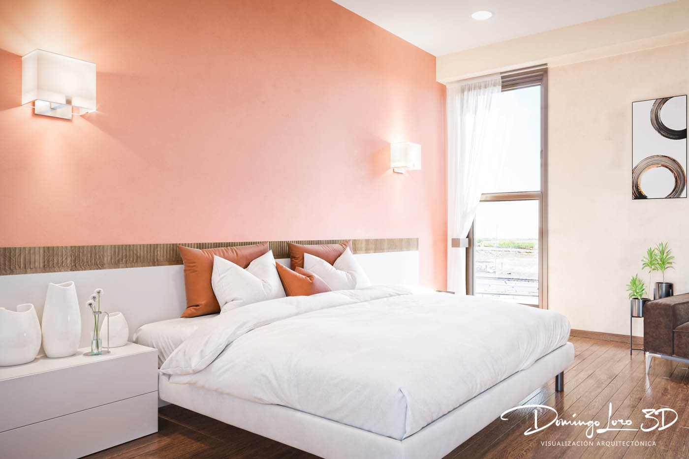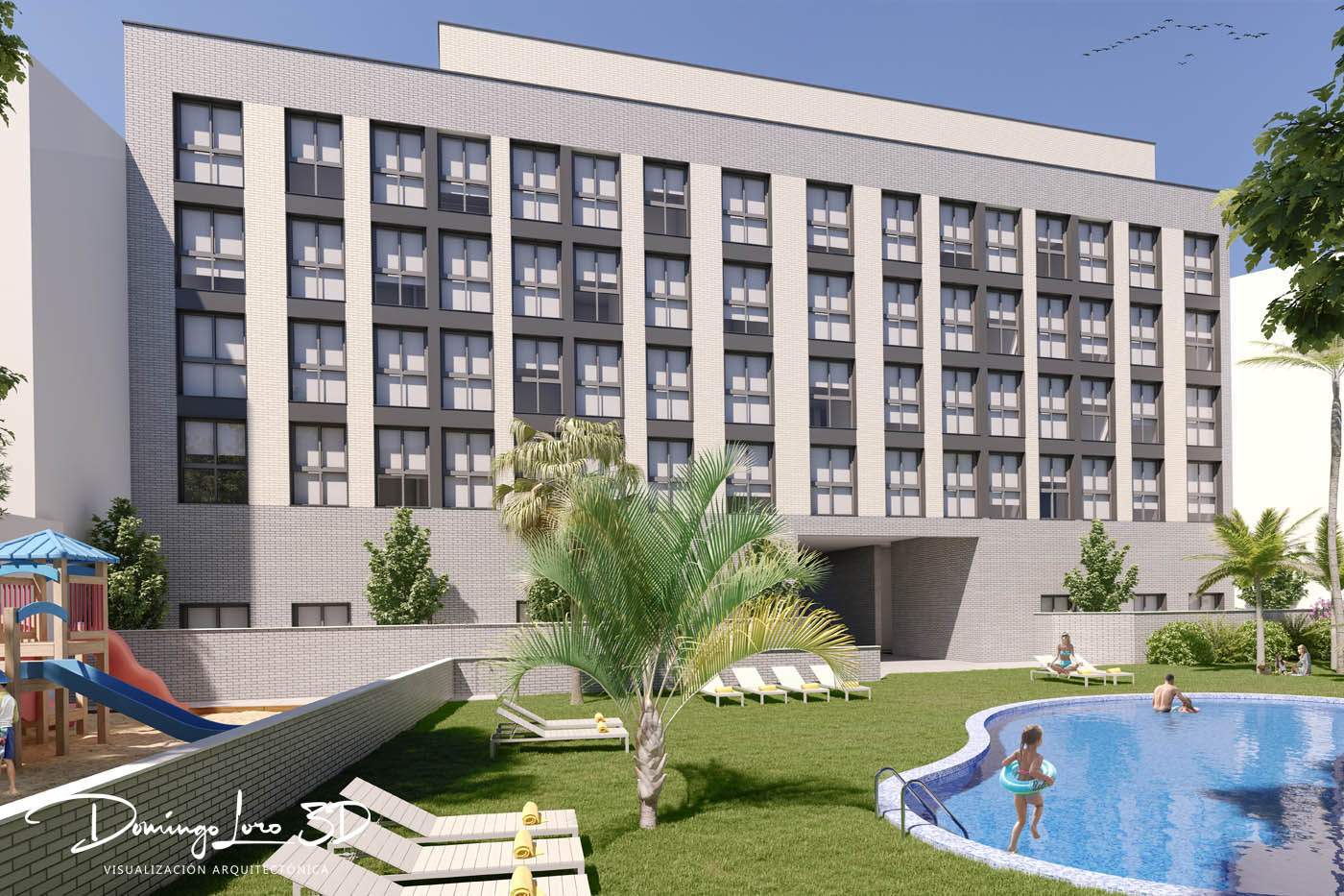 Render de arquitectura 3D de un edificio residencial integrado en una fotografía realizada con un dron e interiores de una de las viviendas: salón, cocina, dormitorio y baño realizados con infografía 3D para la comercialización de una promoción inmobiliaria. Estos renders 3D son los más representados habitualmente para la comercialización de promociones inmobiliarias ya que se visualiza la fachada exterior del edificio y las habitaciones más importantes de una vivienda y sirven para comprender con gran detalle las características del inmueble a comercializar. Renders 3D con gran calidad y realismo con la mejor relación calidad y precio del mercado. Nuestra metodología de trabajo, contrastada durante 20 años de experiencia, nos permite trabajar desde la distancia, sea donde sea, para empresas de toda España con todas las garantías.